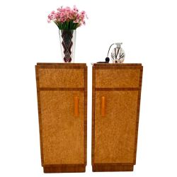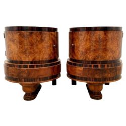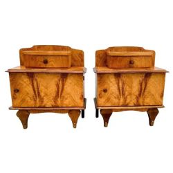 A rare opportunity to acquire such high styled and totally original Art Deco bedside tables. Originating from Italy and dating to the early 1930s they fill both the highly desired shape of Art Deco at its best and sort after the luscious veneers which create the exotic. You will be hard pushed to find more attractive examples on the market at the moment. A mix of veneers to delight the eye are heavily figured Italian Walnut. Lots of storage space, both in the drawer and the interior shelving. The tops of the cabinets are black vitrolite glass which is in very good condition. Both cabinets have been through our workshops and are fully restored.