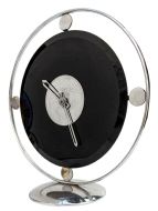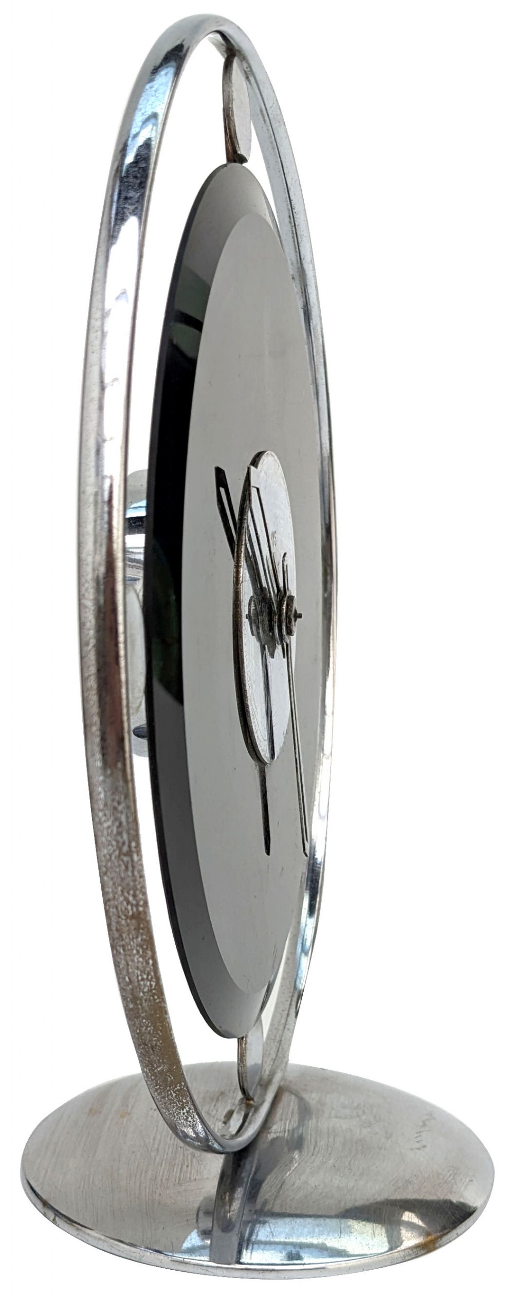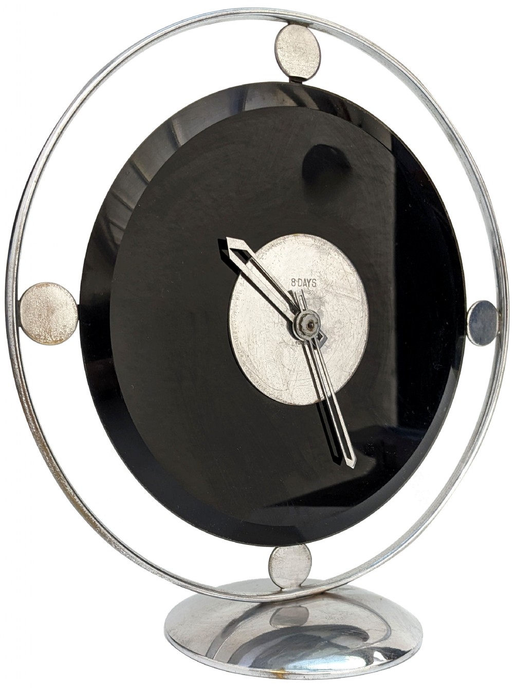For your consideration is this large modernist mantle clock standing 25 cm high. Eight day movement. The body of the clock is chrome with a centre circle of black vitrolite ( black compressed glass ). Superb styling and great size, full working order having been fully serviced. There is some wear to the chrome which is reflected in the price. Offered with FREE UK mainland delivery UK customers: we want you to be delighted with your purchases from us and so we offer a full money back guarantee (items must be returned within 14 days in same condition as when sent) if you are not fully satisfied with your purchases from us for what ever reason and would like to return them. Please note : Shipping costs are not refundable. Refunds are only issued once an item has been returned back to us. Refunds are issued within 48 hours in receipt of return.
