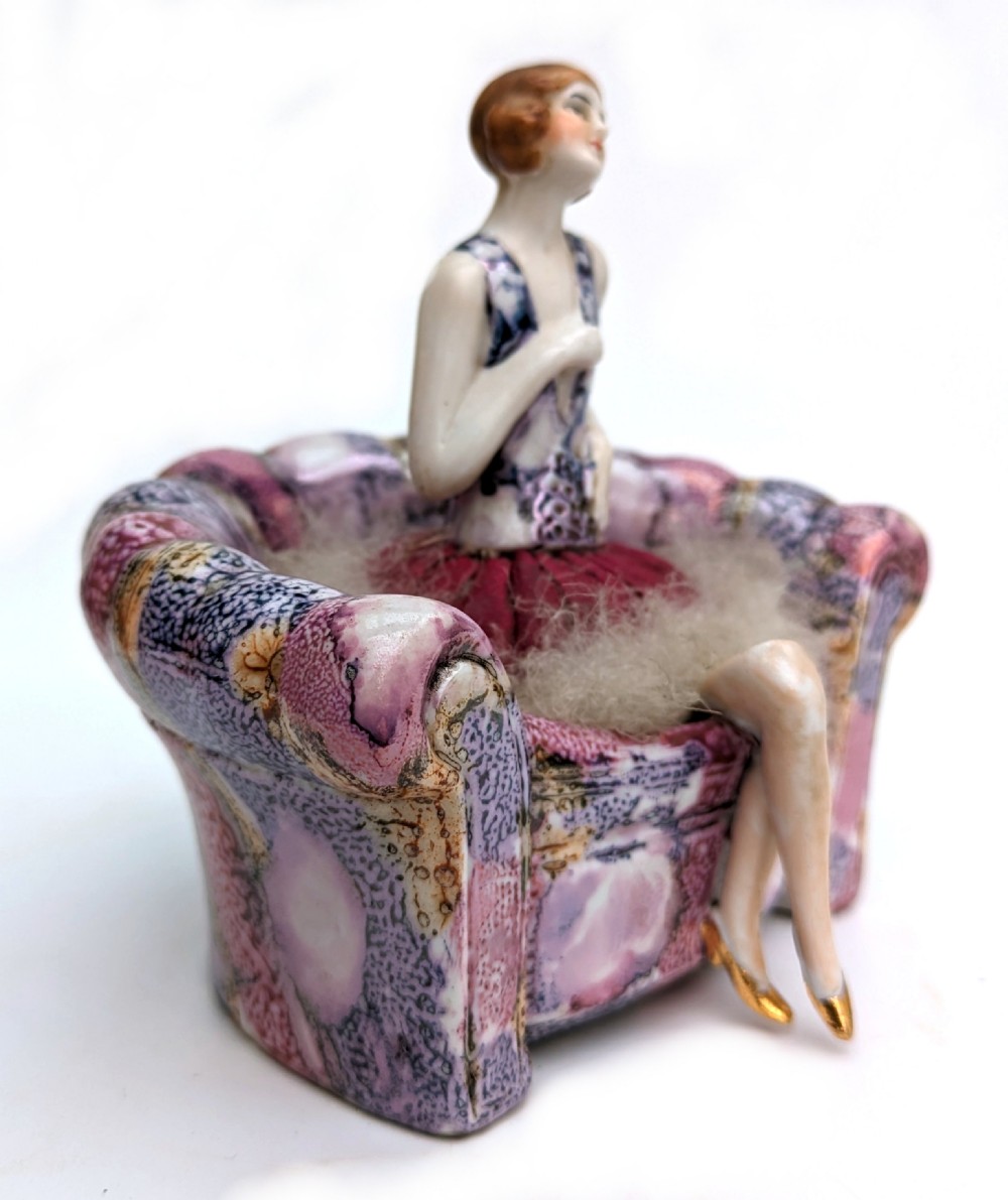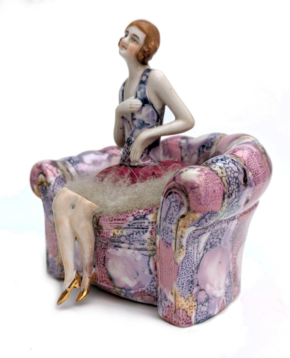 Dating to the 1930's this very attractive and rare Art Deco powder bowl stand. Depicts a flapper girl sat on a a chair with her legs . The attention to detail is just wonderful, so skillfully painted, from her slightly blushed cheeks to her tiny fingers, everything about this piece screams quality and at every angle she looks amazing. These powder boxes as any collector will agree when reading this hard extremely hard to come by. Part of the half doll family, these boxes are highly collectable. Originating from France this particular model has a hotel stamp on the reverse which we've never seen before. We think these were probably complimentary pieces on a ladies dressing table in the hotel bedroom. Free from damage just showing some firing flaws on the seat of the chair, everything else is as it should be. Height: 4.93 in. (12.5 cm) Width: 4.34 in. (11 cm) Depth: 3.94 in. (10 cm) UK customers: we want you to be delighted with your purchases from us and so we offer a full money back guarantee (items must be returned within 14 days in same condition as when sent) if you are not fully satisfied with your purchases from us for what ever reason and would like to return them. Please note : Shipping costs are not refundable. Refunds are only issued once an item has been returned back to us. Refunds are issued within 48 hours in receipt of return.
