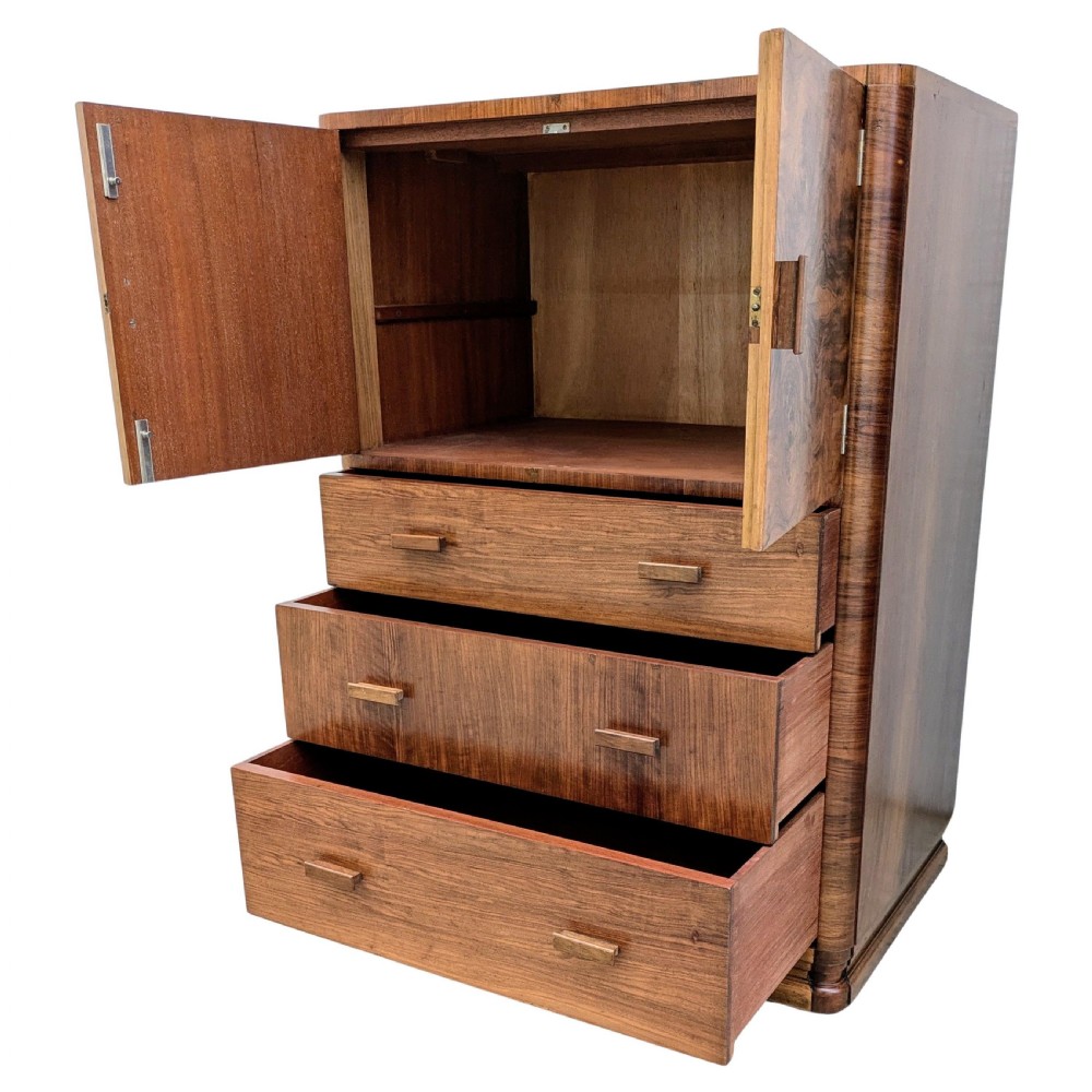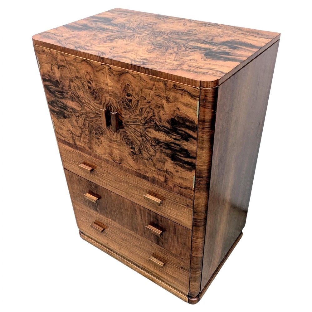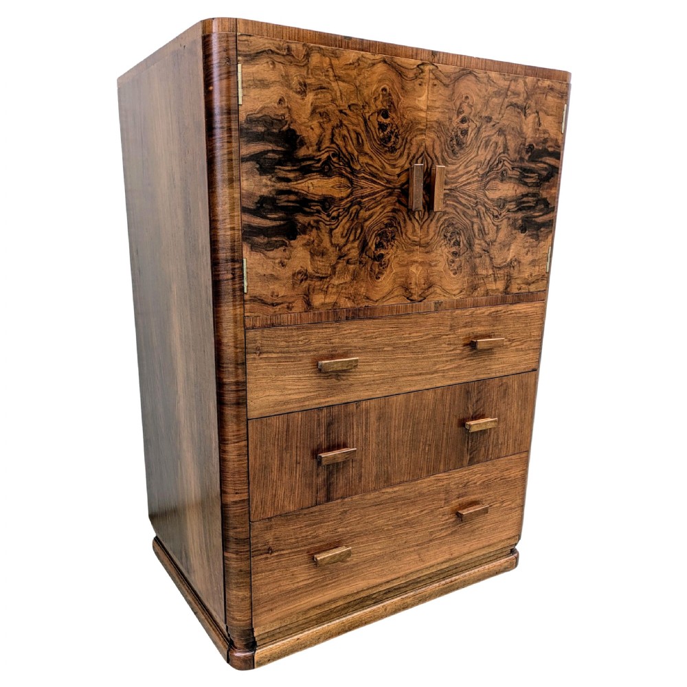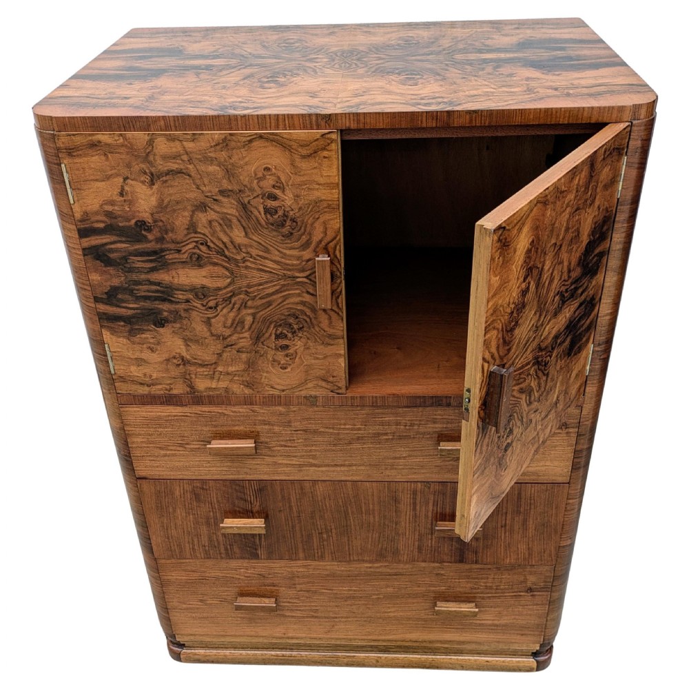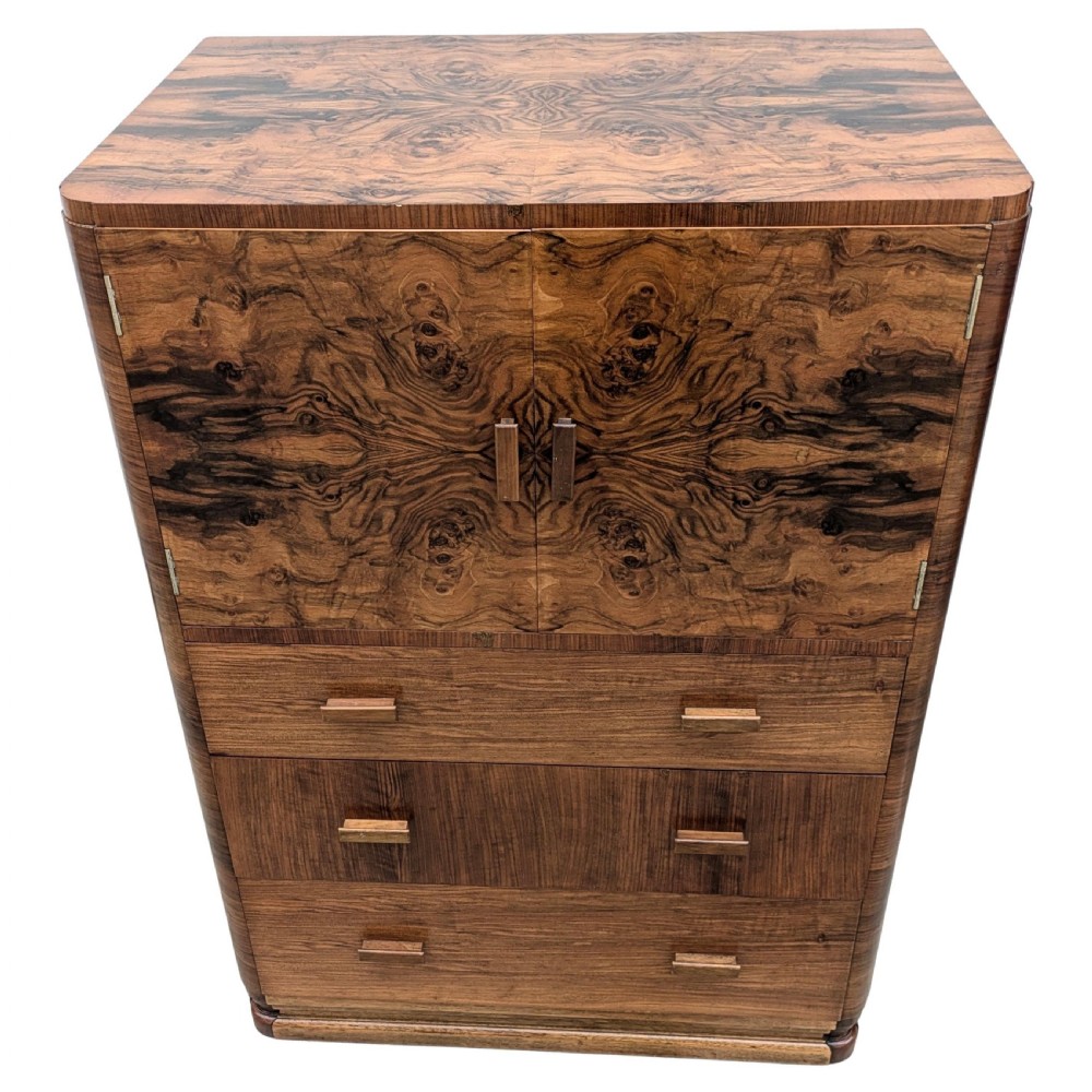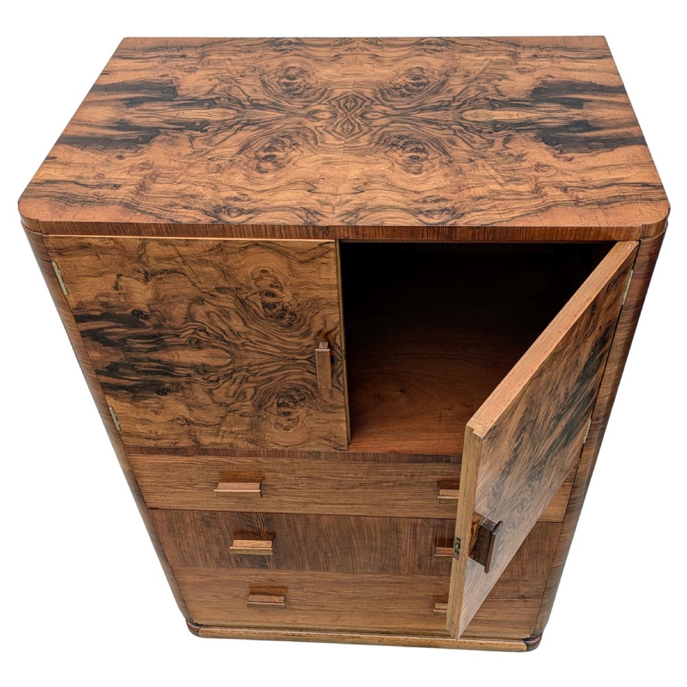 Offered with FREE courtesy two man delivery is this real treasure from the 1930s is this Art Deco tallboy . On first viewing this piece one can't not be impressed by the obvious quality and reduced size , made from solid oak for the carcass with a beautifully heavily figured walnut book paged veneers to the exterior, it just oozes style and luxury. A very solid, heavy piece that will last any new owners lifetime and beyond. The doors both open smoothly with a latch to secure. Brass hinges all working well and not corroded. Lots of useful and generous sized storage within, with two very generously sized open shelves and three full length drawers to the base. We've given this piece a professional and full restoration . It's free from any damage and is in very good showroom condition with a beautiful polished finish. UK customers: we want you to be delighted with your purchases from us and so we offer a full money back guarantee (items must be returned within 14 days in same condition as when sent) if you are not fully satisfied with your purchases from us for what ever reason and would like to return them. Please note : Shipping costs are not refundable. Refunds are only issued once an item has been returned back to us. Refunds are issued within 48 hours in receipt of return.