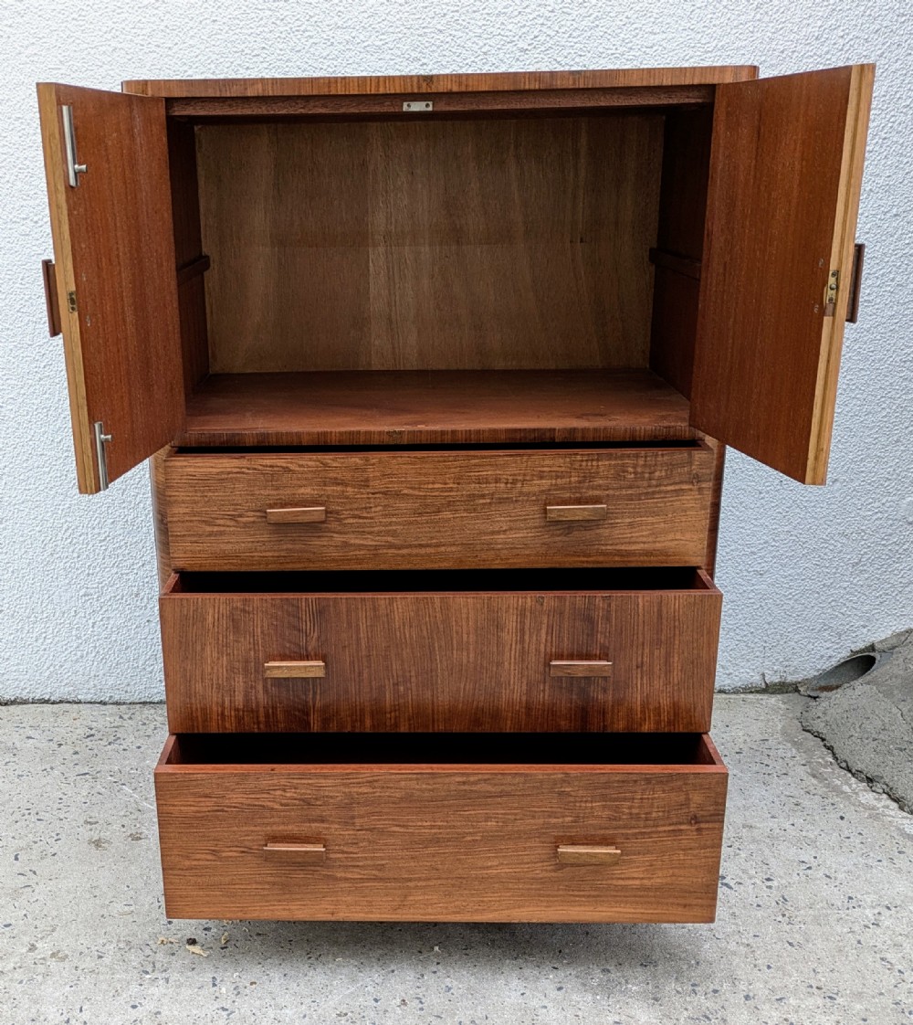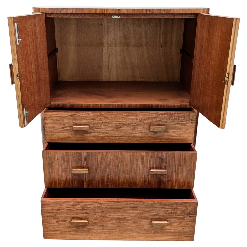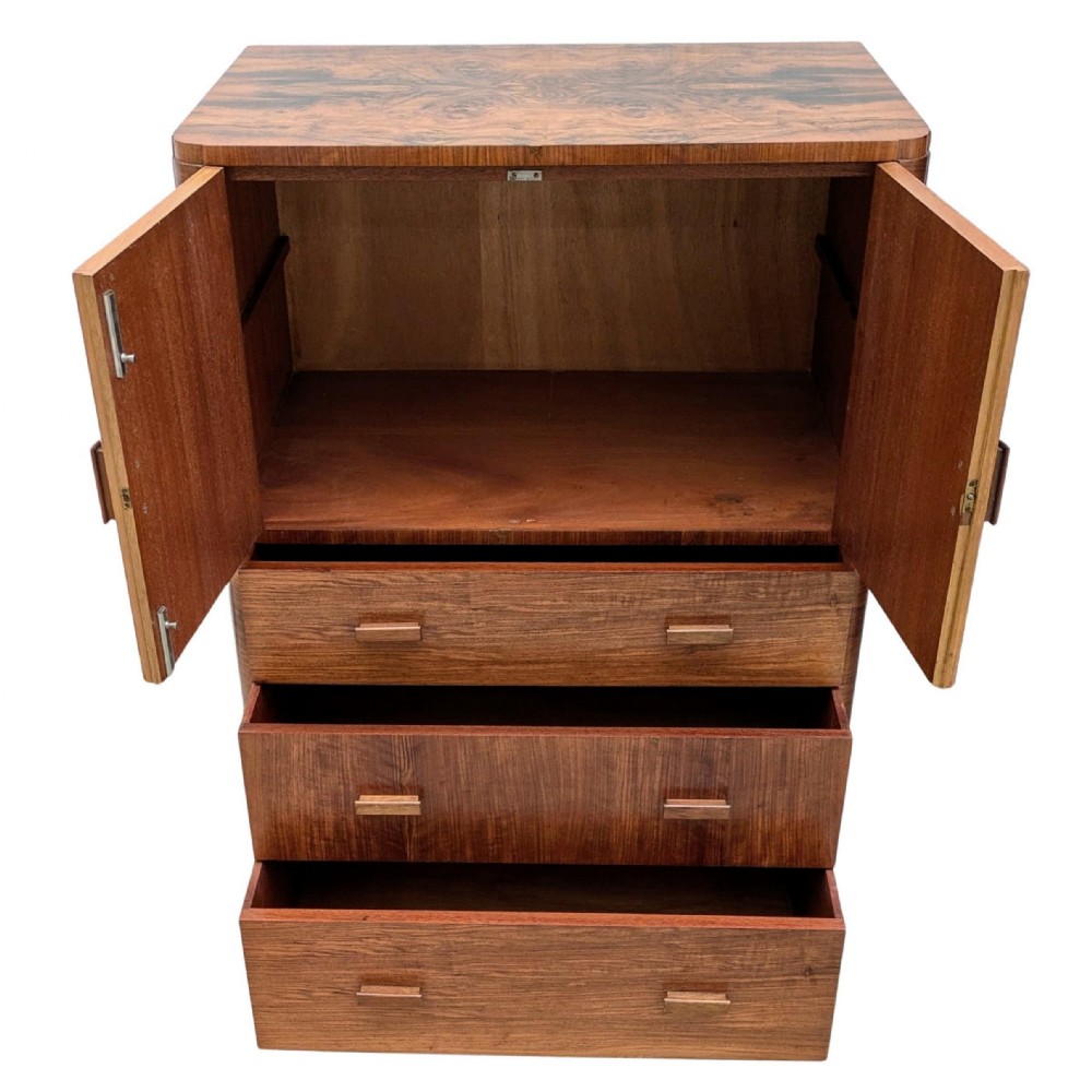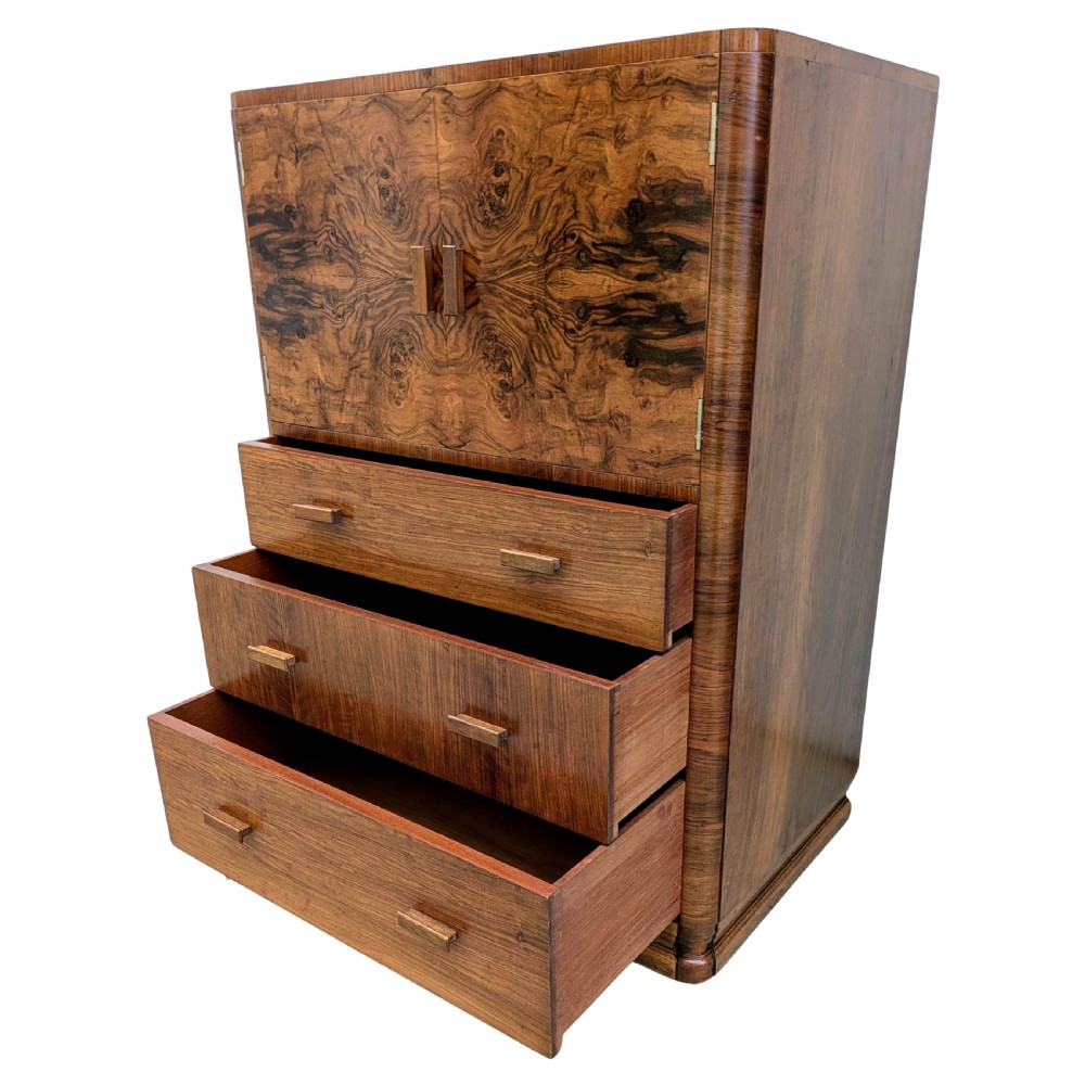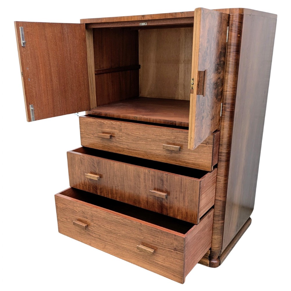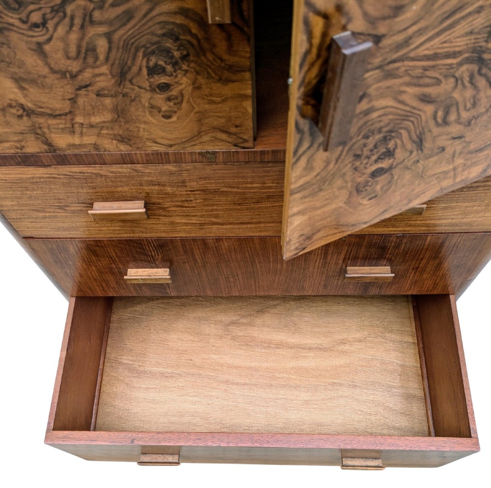 Offered with FREE courtesy two man delivery is this real treasure from the 1930s is this Art Deco tallboy . On first viewing this piece one can't not be impressed by the obvious quality and reduced size , made from solid oak for the carcass with a beautifully heavily figured walnut book paged veneers to the exterior, it just oozes style and luxury. A very solid, heavy piece that will last any new owners lifetime and beyond. The doors both open smoothly with a latch to secure. Brass hinges all working well and not corroded. Lots of useful and generous sized storage within, with two very generously sized open shelves and three full length drawers to the base. We've given this piece a professional and full restoration . It's free from any damage and is in very good showroom condition with a beautiful polished finish. UK customers: we want you to be delighted with your purchases from us and so we offer a full money back guarantee (items must be returned within 14 days in same condition as when sent) if you are not fully satisfied with your purchases from us for what ever reason and would like to return them. Please note : Shipping costs are not refundable. Refunds are only issued once an item has been returned back to us. Refunds are issued within 48 hours in receipt of return.