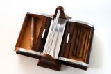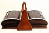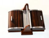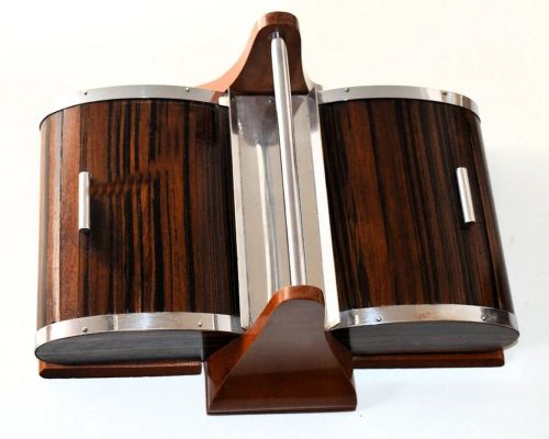 For your consideration is this superbly iconic Art Deco walnut cady. Features a pair of back-to-back roll top tambour style cigar boxes divided by a polished aluminium dividing 'shelf' are supported on a wooden base together with a central carrying handle. This box is a great size, larger than normal, making it a very functional piece, many possible uses such as jewellery, trinkets, writing, money, you decide.