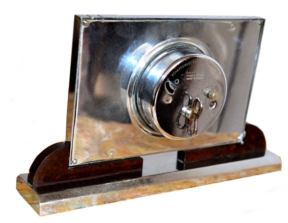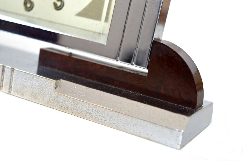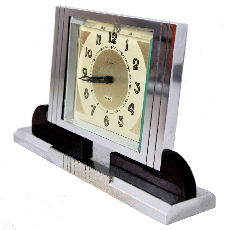 Very stylish 1930's Art Deco chrome and bakelite clock by the French manufacturers Jaz. Deceptively weighty time piece showing the quality that one expects from this maker. In full working order and in great condition this is an ideal clock for modern day use. Superb quality chrome frame, highlighted with brown bakelite supports, and a clear reflective silvered dial with very Art Deco style fingers and a bevelled glass face. Fabulously stylish 8-day Deco clock for any authentic Art Deco interior. In very good original & clean condition ; the chrome on the clock surround is 'as new' ; the chrome on the base has some very slight tarnishing ( on very close examination ), but is absolutely fine & just consistent with it's near 90 year age. FREE UK mainland delivery UK customers: we want you to be delighted with your purchases from us and so we offer a full money back guarantee (items must be returned within 14 days in same condition as when sent) if you are not fully satisfied with your purchases from us for what ever reason and would like to return them. Please note : Shipping costs are not refundable. Refunds are only issued once an item has been returned back to us. Refunds are issued within 48 hours in receipt of return.
