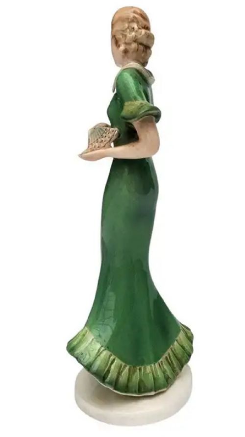 Art Deco Tall Ceramic Green Dress Lady, German, c1930