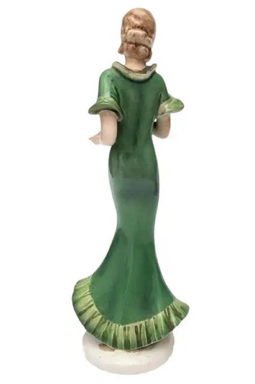 Beautiful Art Deco figurine of a lady in a striking green dress in a dance pose. No factory mark to indicate maker but has incised factory number, see images. The figurine stands 25 cm which is around 10 inches in height, so good size. She's dressed in the fashion of the day with dark blonde hair again very representative of this wonderful bygone era. The make up is delicately painted with soft blush cheeks and charcoal eyes. She's offered in very good condition with a some minor crazing on the glazing but nothing to distract. No past restorations or damage such as cracks or chips etc. A perfect piece to add to any Art Deco collection, she definitely won't disappoint.