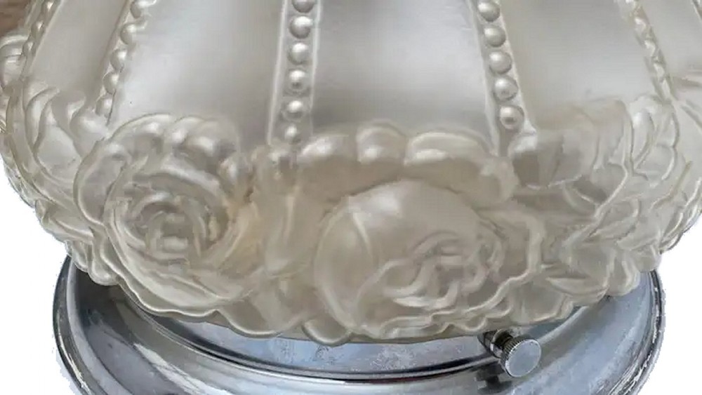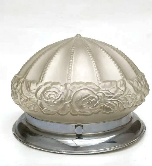 Beautiful 1930s English Art Deco ceiling light in molded pressed glass. The globe is decorated with stylized embossed rose patterns developed on the skirt of the shade, tinted in sepia satin glass. The chrome gallery is plated brass with three fastening screws. Opening at the neck 7.8 cm, bayonet socket B 22. This lamp could also work well as a table lamp, perhaps for a bedside table or desk lamp. The shade sits within a chrome gallery. A good size that would work perfectly for entryways, hallways or medium sized room. FREE UK mainland delivery UK customers: we want you to be delighted with your purchases from us and so we offer a full money back guarantee (items must be returned within 14 days in same condition as when sent) if you are not fully satisfied with your purchases from us for what ever reason and would like to return them. Please note : Shipping costs are not refundable. Refunds are only issued once an item has been returned back to us. Refunds are issued within 48 hours in receipt of return.