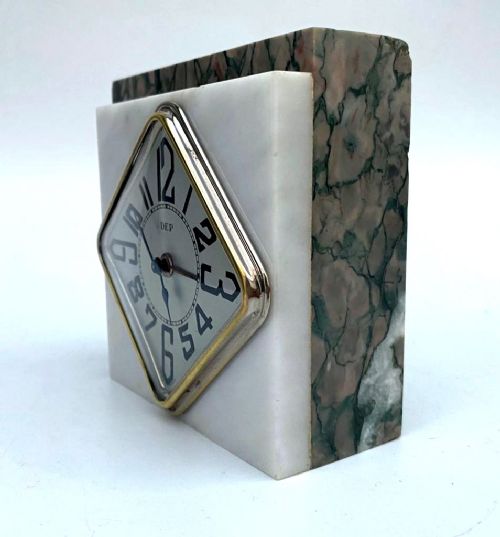 Made by the renowned French maker DEP ~ from the Depary family name, who flourished in the Art Deco era of the 1920s and 30s. Also marketed at this time to stand for Durée, Elegance and Precision. Very stylish cubist shape, with an offset white marble block incorporating the face, set off against a larger variegated marble backing. Lovely clear face with it's superb Art Deco stylised elongated numerals that can't be mistaken for any other era. It is in really excellent original clean condition ~ please refer to the detailed photographs. Fully serviced by a qualified horologist. Please note this clock works better as do all mechanical clocks on a perfectly flat surface, and after moving needs a very gentle shake to start it off again, but then once settled, it has had no problems. Beautiful quality and lovely little clock & very evocative of the Art Deco period. The new owner will not be disappointed. FREE UK delivery UK customers: we want you to be delighted with your purchases from us and so we offer a full money back guarantee (items must be returned within 14 days in same condition as when sent) if you are not fully satisfied with your purchases from us for what ever reason and would like to return them. Please note : Shipping costs are not refundable. Refunds are only issued once an item has been returned back to us. Refunds are issued within 48 hours in receipt of return.