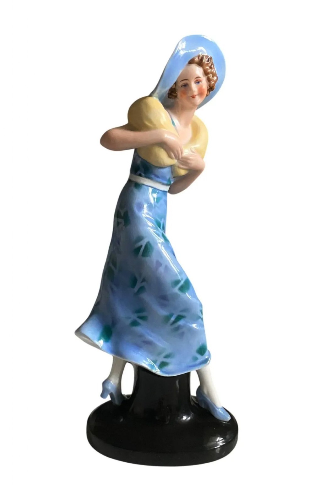 For your consideration is this very attractive and totally Art Deco glazed porcelain flapper girl figurine dating to around 1935. She's an impressive height standing 23.5 cm overall. This wonderful figure is in the form of a flapper girl dressed in the fashion of the day in a pretty blue floral dress with matching hat and with pale lemon yellow fur stole. The attention to detail is just wonderful, so skillfully painted, from her slightly blushed cheeks to her creased coat, everything about this piece screams quality and at every angle she looks amazing. This figure is manufactured by the German factory Wagner & Apel of Thuringia and is marked to the base, please see images. Offered in great good condition with no chips, cracks or crazing and no paint wear or restorations. BIO Wagner & Apel Porzellan ( English : Wagner & Apel Porcelain ) is a porcelain manufacturer in the small town of Lippelsdorf in the Thuringian Forest, Germany Since 1877, porcelain has been made there entirely by hand. The family business is being run by the fourth and fifth generation. FREE UK delivery UK customers: we want you to be delighted with your purchases from us and so we offer a full money back guarantee (items must be returned within 14 days in same condition as when sent) if you are not fully satisfied with your purchases from us for what ever reason and would like to return them. Please note : Shipping costs are not refundable. Refunds are only issued once an item has been returned back to us. Refunds are issued within 48 hours in receipt of return.