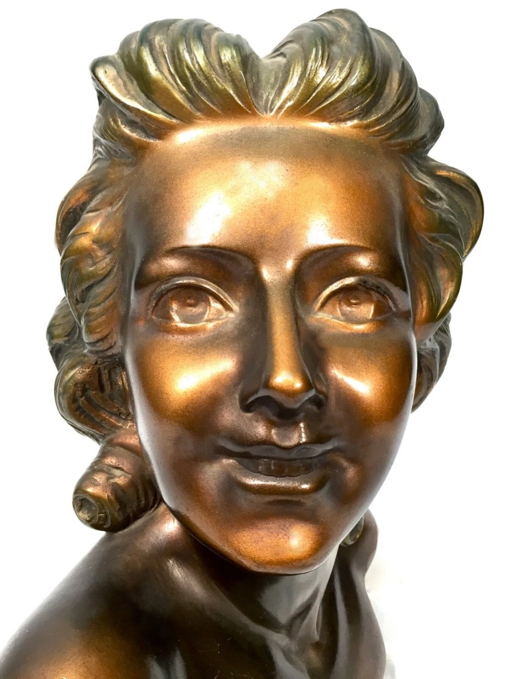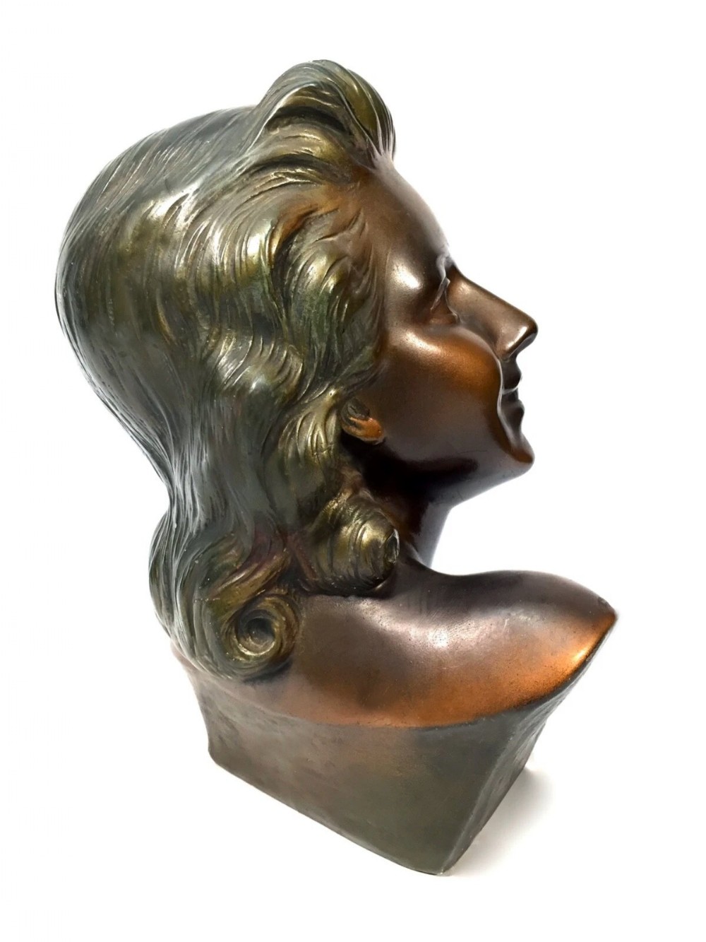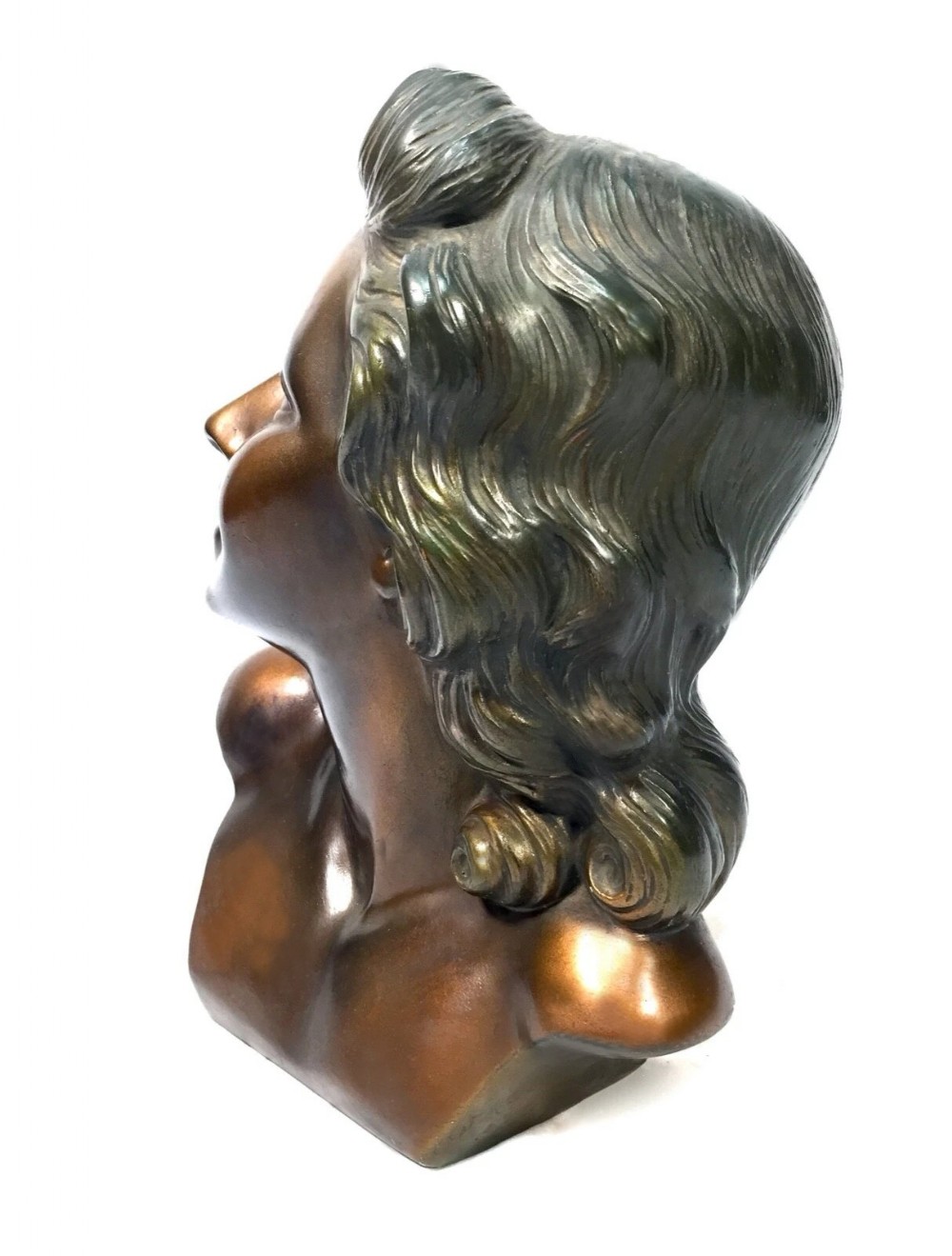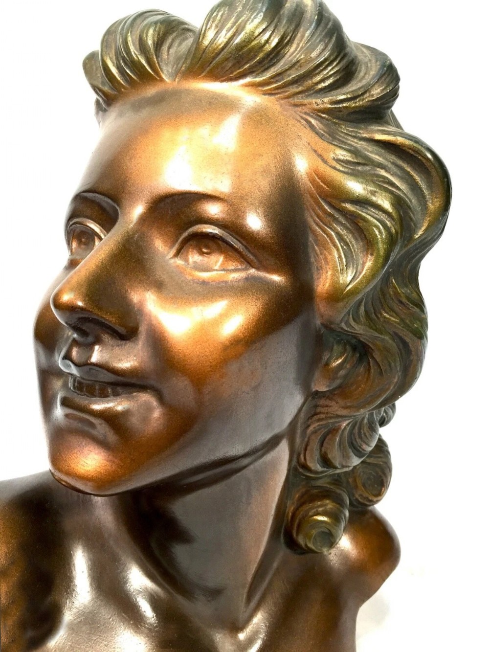 Very attractive French Art Deco bust of very high quality. Totally authentic and in excellent condition. Made from Plaster she weighs quite heavy. This bust is the perfect size for display, originally quite possibly used as a shop mannequin. She dates to the late 1930's and is beautifully cast. She's a bronze finish with tints of green in her hair, lovely detailing. FREE UK Mainland delivery UK customers: we want you to be delighted with your purchases from us and so we offer a full money back guarantee (items must be returned within 14 days in same condition as when sent) if you are not fully satisfied with your purchases from us for what ever reason and would like to return them. Please note : Shipping costs are not refundable. Refunds are only issued once an item has been returned back to us. Refunds are issued within 48 hours in receipt of return.