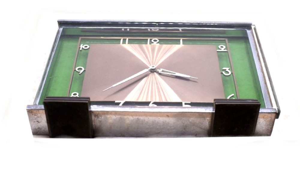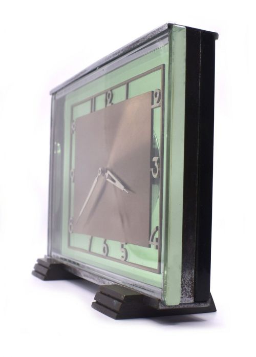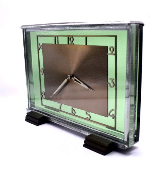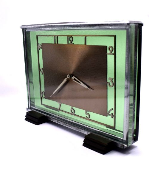 Still with it's original box is this very impressive and rare 1930's Art Deco green and clear glass and chrome 8 day clock. Superb condition, just some mild corrosion to some areas of the chrome as you could expect from a period piece of 90 odd years. With Original Eight Day movement which has been cleaned and serviced by our fully qualified horologist so comes to you in full working order and keeping good time. Excellent size too, will look great as a mantel clock or desk area. FREE UK MAINLAND DELIVERY To view over 1000 Art Deco originals we currently hold visit www.artdecoworld.co.uk UK customers: we want you to be delighted with your purchases from us and so we offer a full money back guarantee (items must be returned within 14 days in same condition as when sent) if you are not fully satisfied with your purchases from us for what ever reason and would like to return them. Please note : Shipping costs are not refundable. Refunds are only issued once an item has been returned back to us. Refunds are issued within 48 hours in receipt of return.