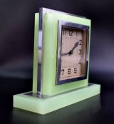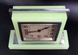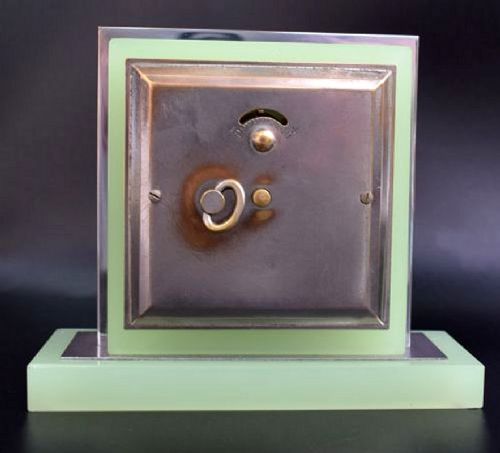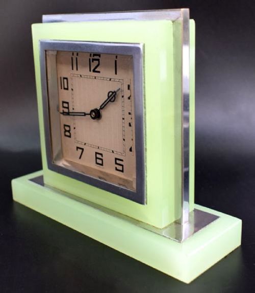 Original 1930's Art Deco green glass 30 hour clock with chrome accents. Perfect size for desk or table. We have two of these clocks currently should you want a pair, let us know. It’s freshly serviced with the mechanism having been through an ultrasonic cleaner, reassembled and lightly oiled so is in good working order and keeps good time. 95 odd years old this clock will live another life time. No damage to report everything is in very good vintage condition. This lovely clock that will enhance any setting.