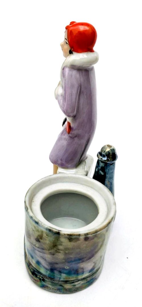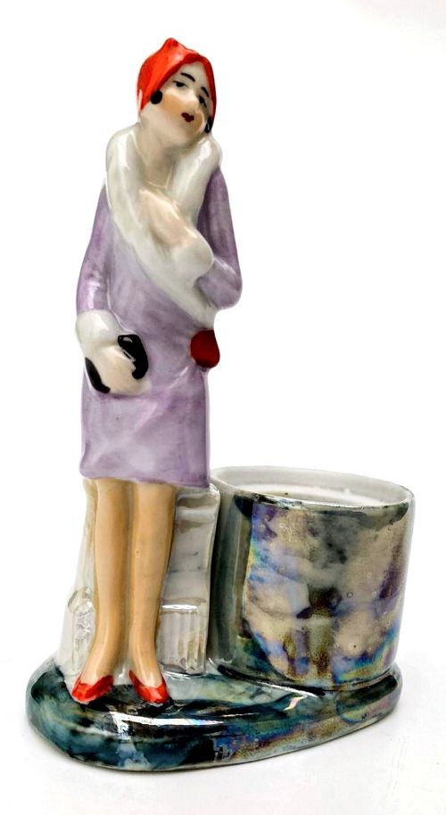 or your consideration is this very attractive and totally original Art Deco glazed porcelain flapper girl figurine dating to around 1935. She's an impressive height standing 12 cm overall. This wonderful figure is in the form of a flapper girl dressed in the fashion of the day in a pretty fur lined lilac wrap coat and cloche hat and very enchanting porcelain powder / trinket box, dating to the 1930's , sourced in France. The attention to detail is just wonderful, so skillfully painted, from her slightly blushed cheeks to her creased coat, everything about this piece screams quality and at every angle she looks amazing. Behind the figure is a lidded pot which can be used for powder of trinkets.