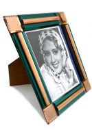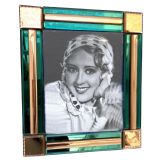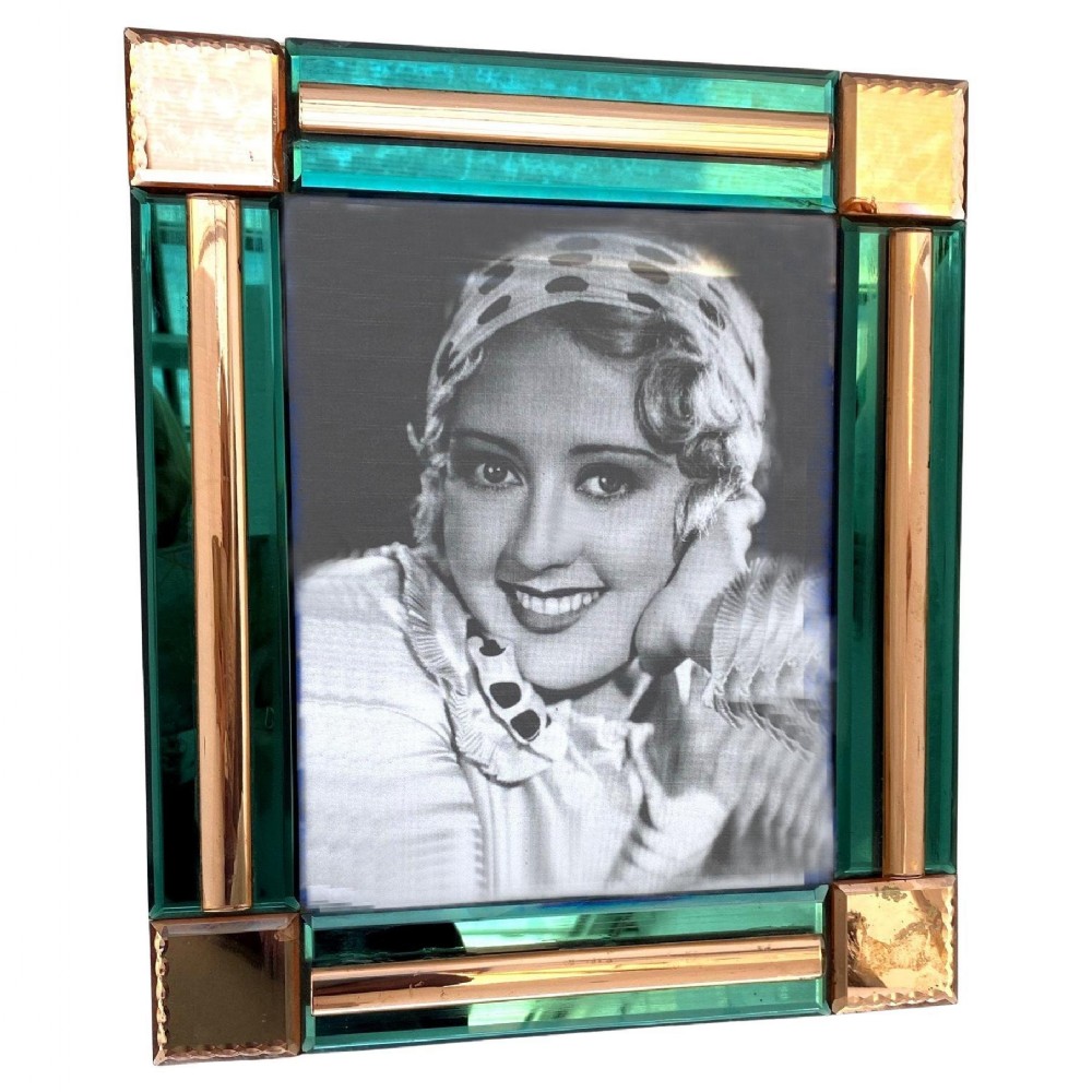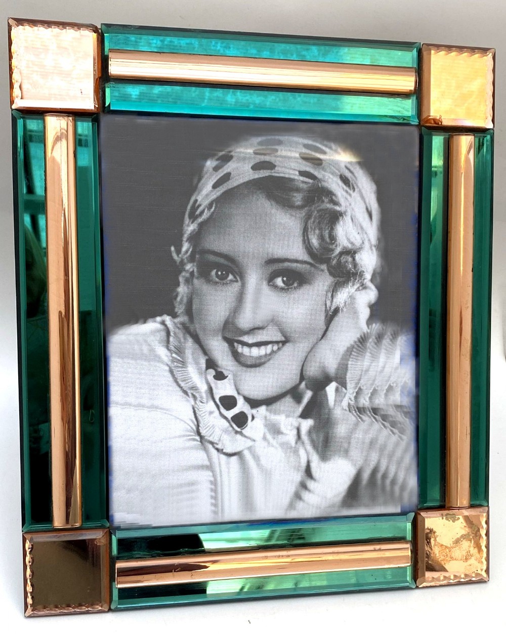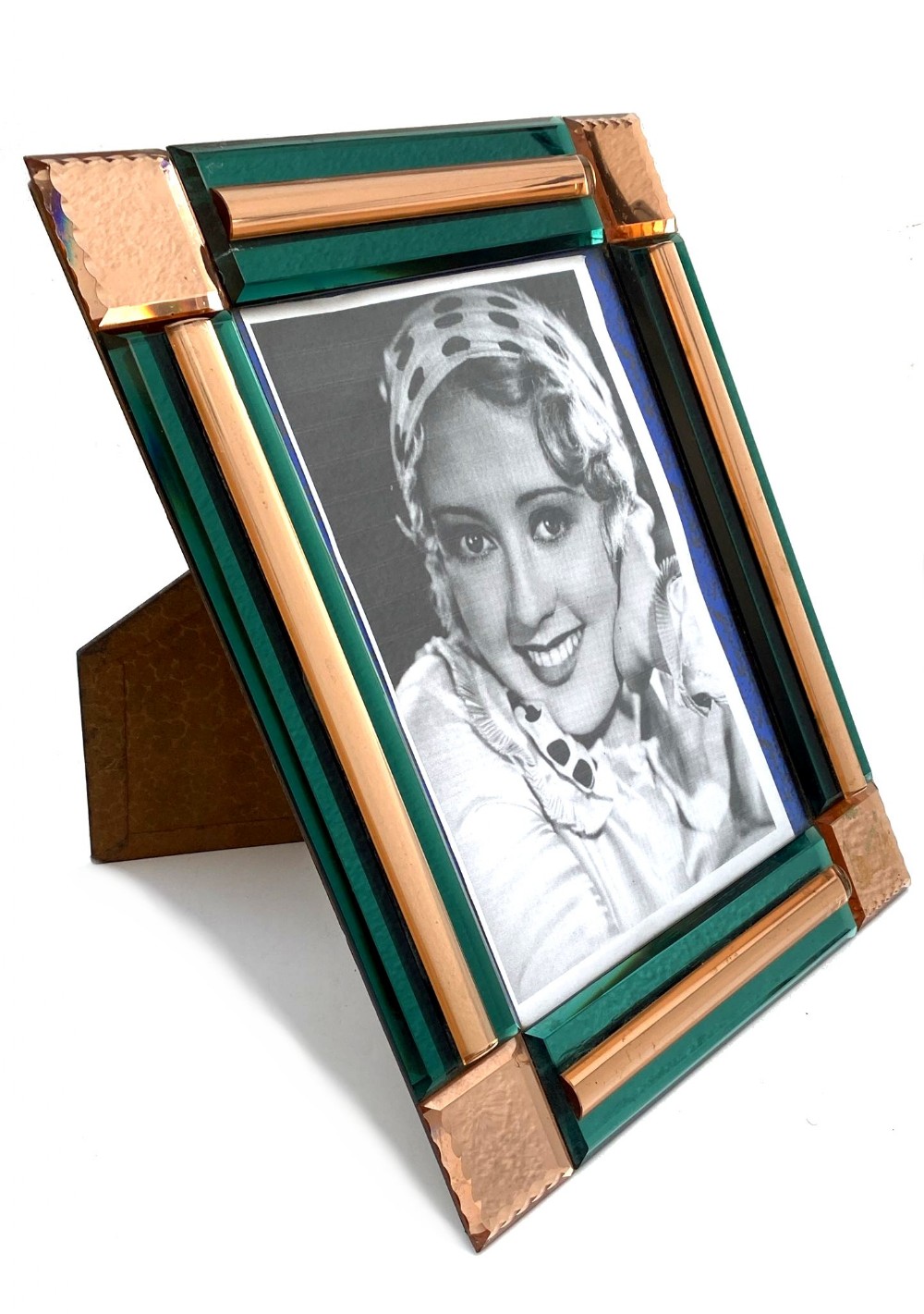 This for your consideration is a fabulously glamorous Art Deco picture frame dating to the 1930s and originating from France. An absolute delight and totally original who wouldn't want this as part of their home interior. The quality is exceptional very thick peach/rose colored mirror glass and emerald green with crimped design border, bevelled edges and deceptively heavy overall. Freestanding with a board backing which is covered in suede type material. Very good overall condition, free from damage, no chips, cracks etc. Some light misting in very small odd areas of the mirror but only seen on close inspection, nothing to detract.