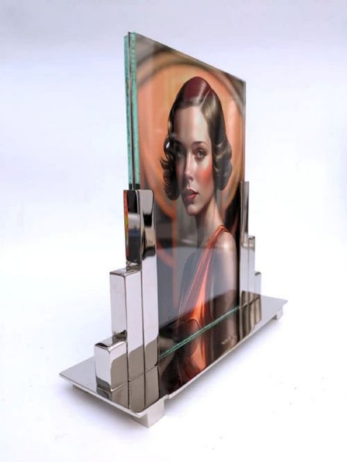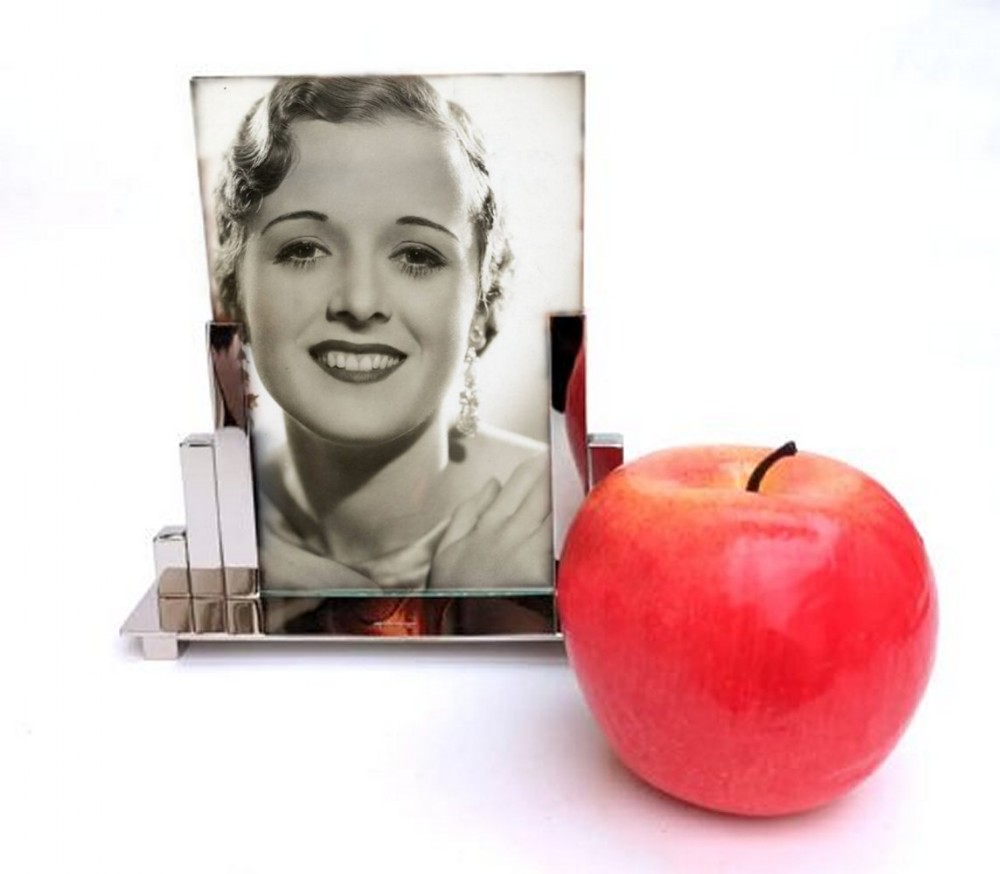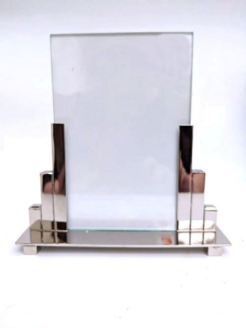Super stylish 1930's Art Deco Modernist picture frame in hall marked nickel plated silver and glass. The frame has two pieces of glass which slot into the side stand which allows an image to be displayed both sides of the free standing frame. Ideal size and perfect for any setting. Originates from Germany and dating to the 1930's. Image size 10 cm x 14.5 cm FREE UK MAINLAND FIRST CLASS DELIVERY UK customers: we want you to be delighted with your purchases from us and so we offer a full money back guarantee (items must be returned within 14 days in same condition as when sent) if you are not fully satisfied with your purchases from us for what ever reason and would like to return them. Please note : Shipping costs are not refundable. Refunds are only issued once an item has been returned back to us. Refunds are issued within 48 hours in receipt of return.