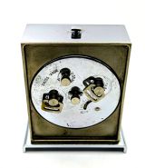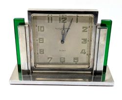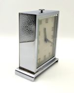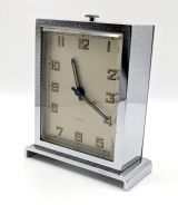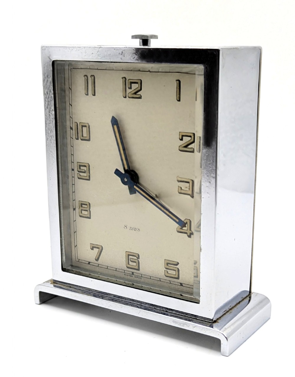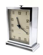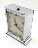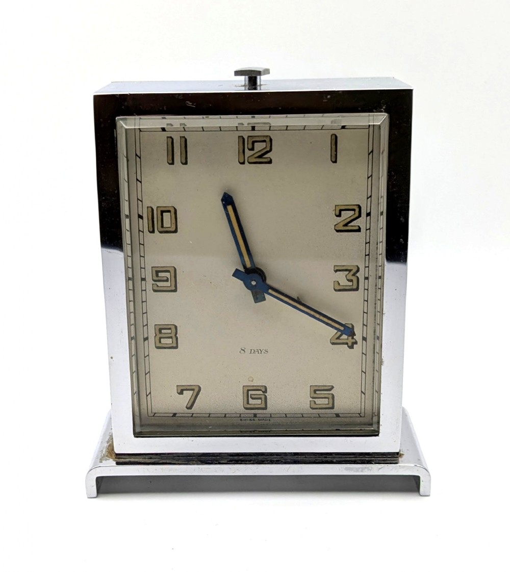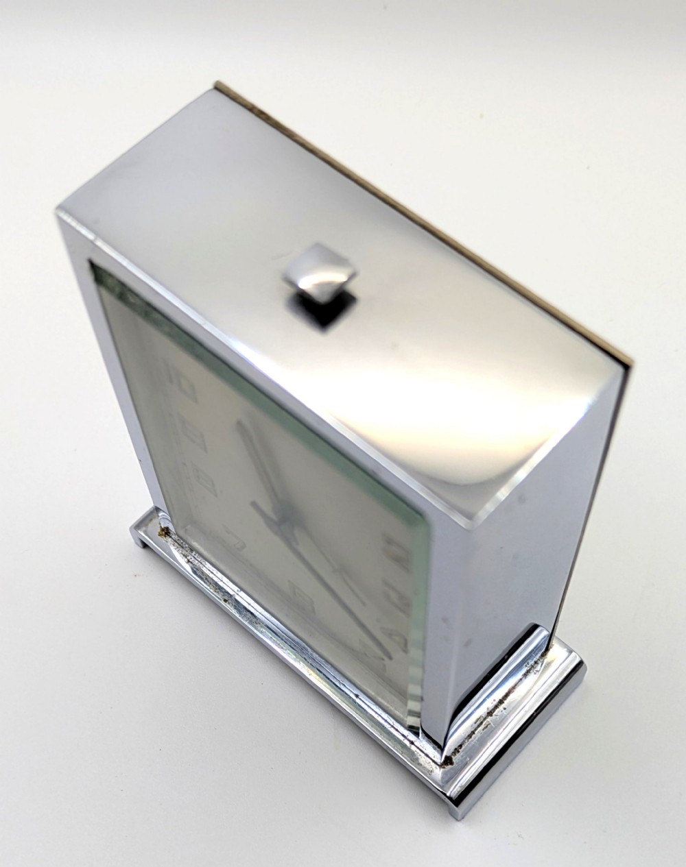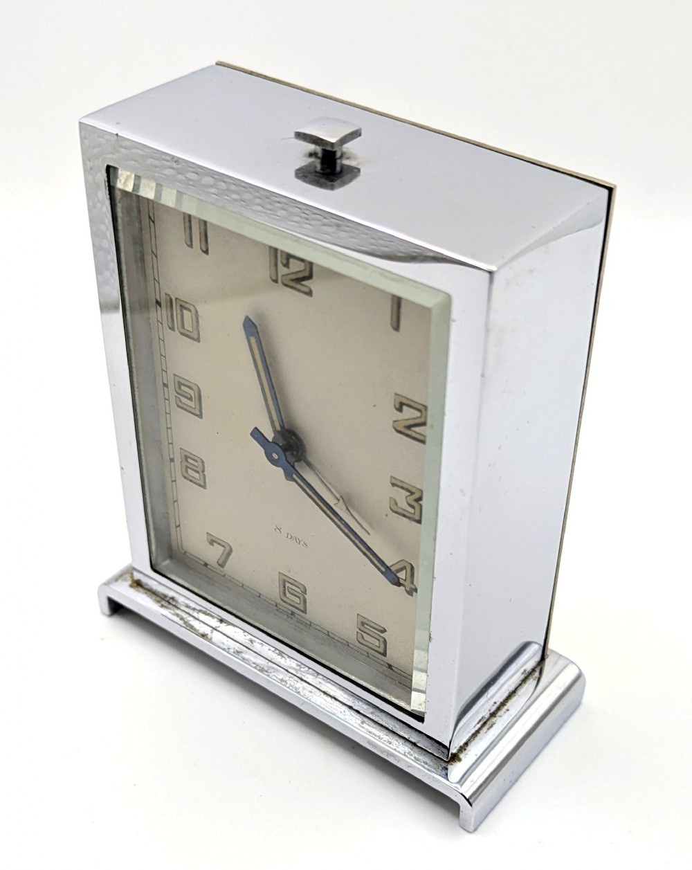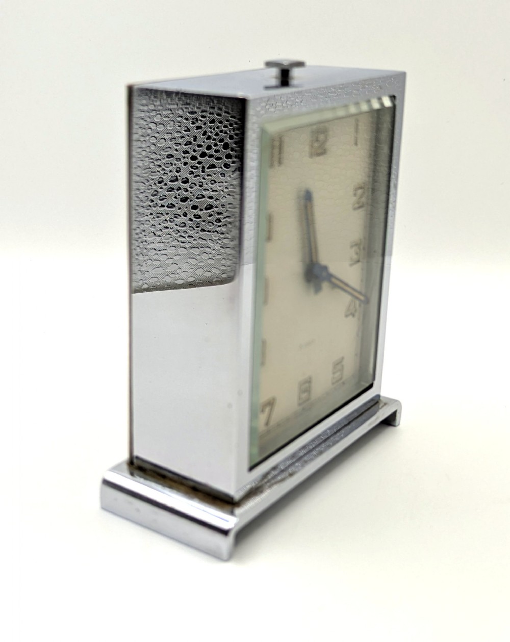 This elegant Art Deco travel clock, crafted for Harrods of London in the 1930s, is a superb example of early 20th-century design. The clock features a striking chrome-plated case with clean geometric lines characteristic of the Art Deco movement, offering both style and sophistication.