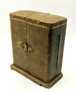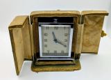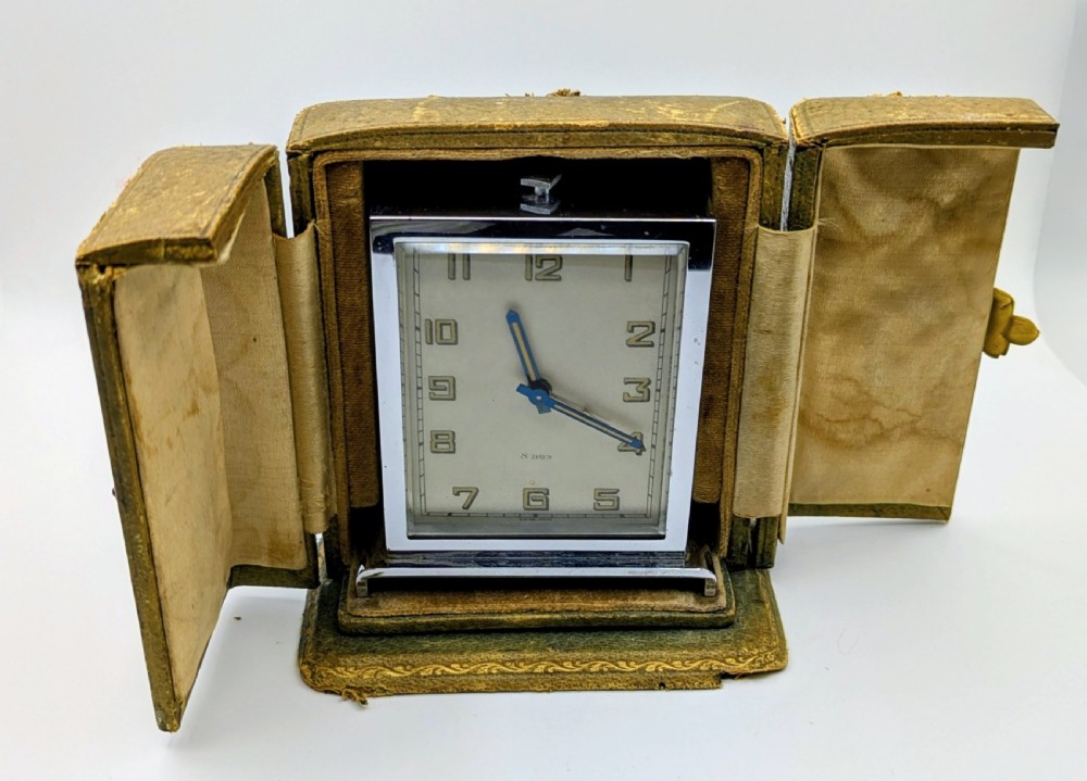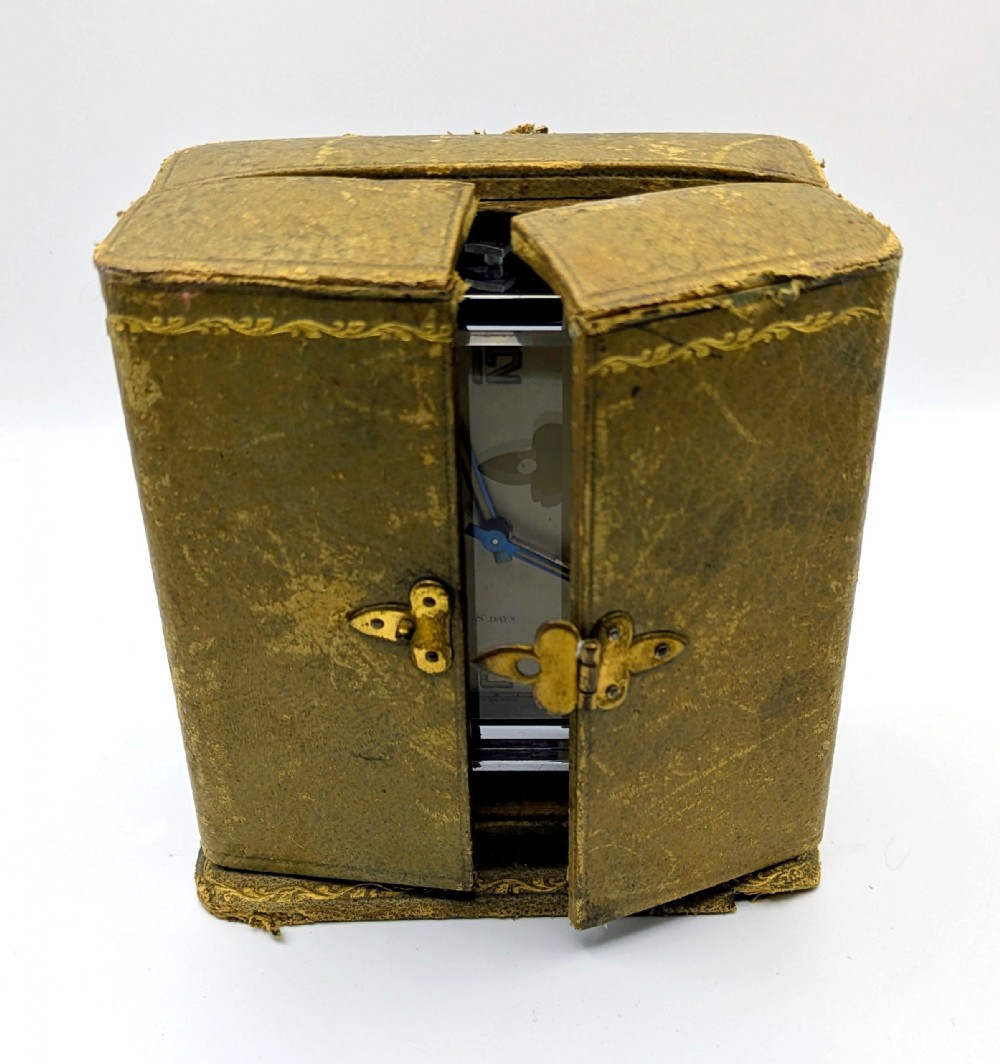 Accompanying the clock is its original leather carry case, a rare surviving accessory that adds to its desirability and collectability. The case shows gentle wear consistent with age and remains structurally sound, providing both protection and historical context.