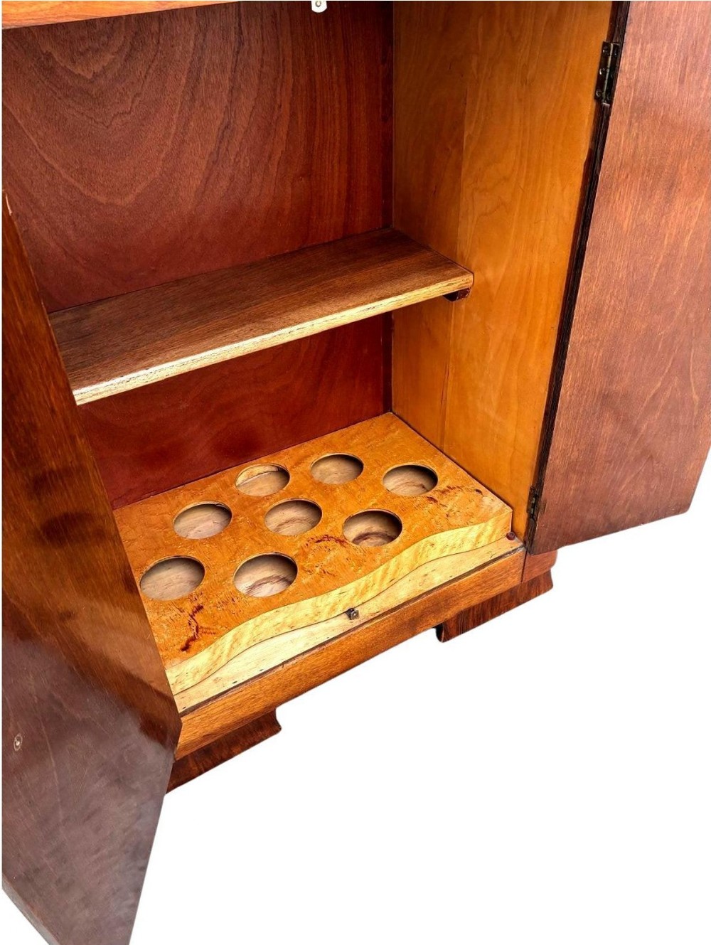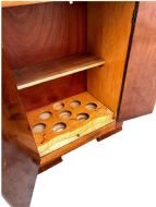 For your consideration is this fabulously stylish 1930's Art Deco cocktail cabinet. This dry bar dates to the 1930's and has all the bells and whistles you want from a cocktail cabinet. The upper interior has a mirrored base and mirrored backing . The lower section of the cabinet opens to reveal a very generously sized shelving space for glasses and bottles. This area will take full size liquor bottles . The cabinet itself is veneered in the most glorious walnut, with heavily figured patterns, the upper interior has blonde maple veneer and a mirrored backing. We've had the whole cabinet restored and so comes to you in great condition. There is some discolouration to the maple interior, only noticeable on close inspection and certainly not anything that distracts. Overall size of this cabinet is also very appealing, large enough to house all your requirements but not so big and rambling to take over a room. FREE UK mainland two man delivery. UK customers: we want you to be delighted with your purchases from us and so we offer a full money back guarantee (items must be returned within 14 days in same condition as when sent) if you are not fully satisfied with your purchases from us for what ever reason and would like to return them. Please note : Shipping costs are not refundable. Refunds are only issued once an item has been returned back to us. Refunds are issued within 48 hours in receipt of return.