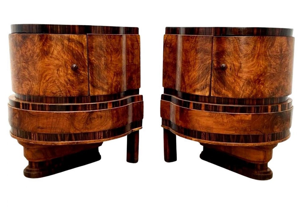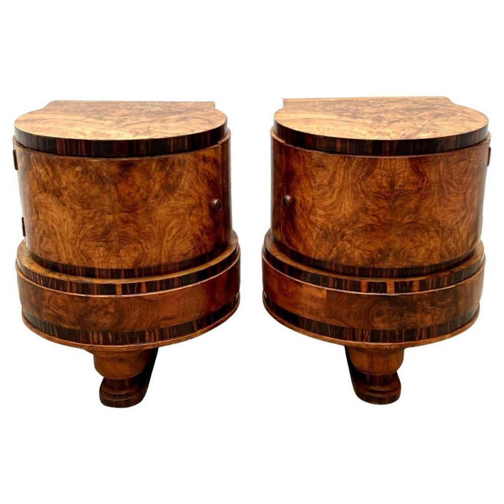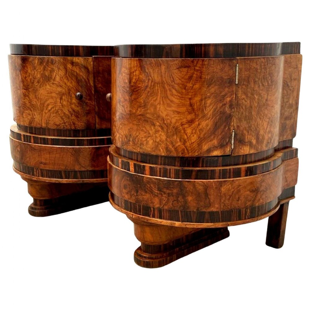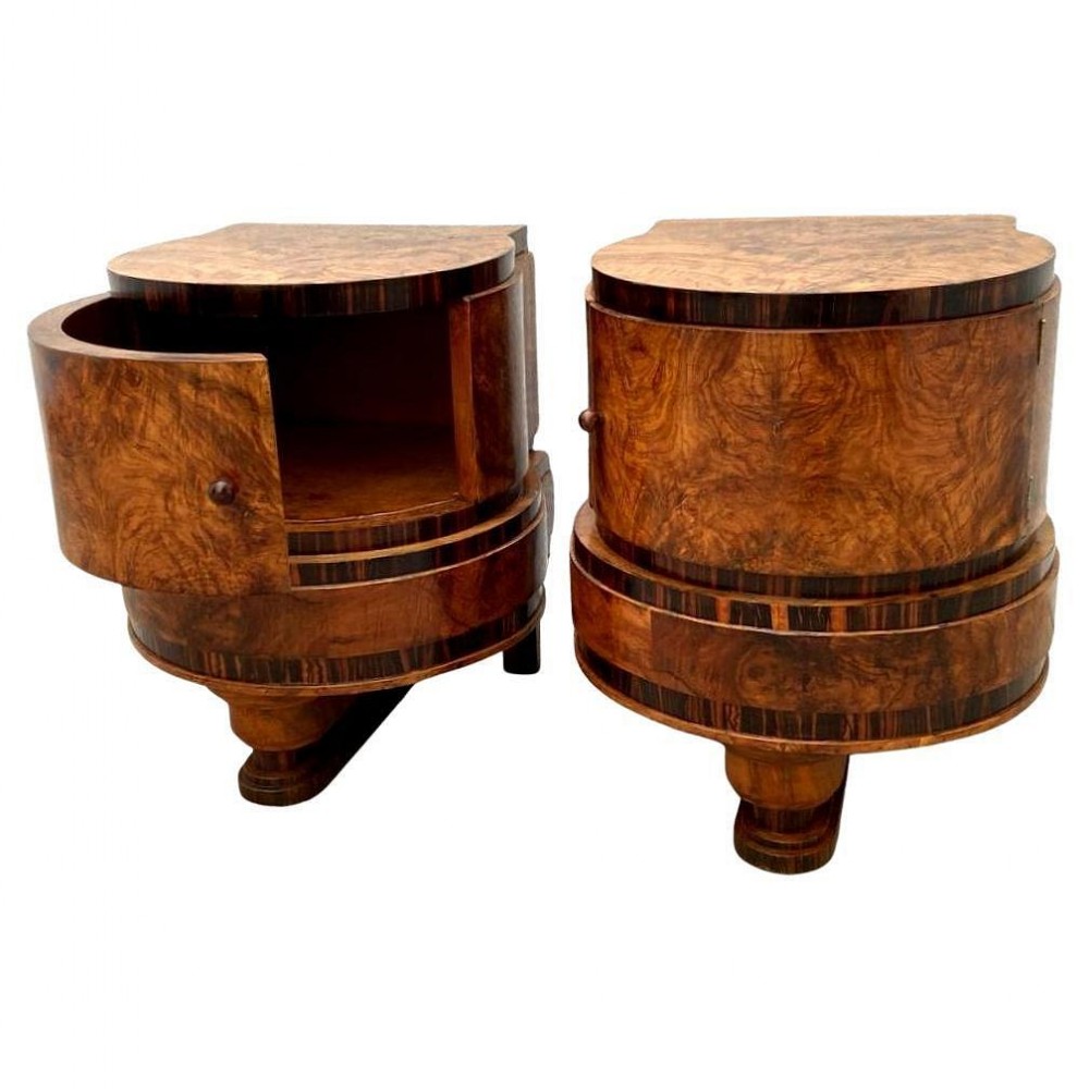 A rare opportunity to acquire such high styled and totally original Art Deco bedside tables. Originating from Italy and dating to the early 1930s they fill both the highly desired shape of Art Deco at its best and sort after the luscious veneers which create the exotic. You will be hard pushed to find better examples on the market at the moment. We've had a handful of these cabinets over the last few years, they becoming increasingly hard to source. A mix of veneers to delight the eye are heavily figured Italian Walnut, Macasar. Lots of internal storage space. Both cabinets have been through our workshops and are fully restored and so come to you in showroom condition. These cabinets definitely won't disappoint they are so attractive and will be appreciated by those with a discerning eye for style, craftsmanship and design. FREE UK DELIVERY UK customers: we want you to be delighted with your purchases from us and so we offer a full money back guarantee (items must be returned within 14 days in same condition as when sent) if you are not fully satisfied with your purchases from us for what ever reason and would like to return them. Please note : Shipping costs are not refundable. Refunds are only issued once an item has been returned back to us. Refunds are issued within 48 hours in receipt of return.