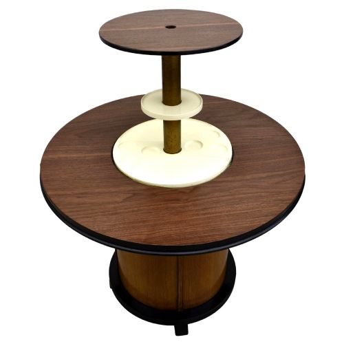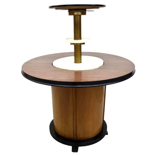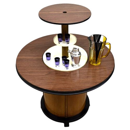 For your consideration is this rather fun and stylish original Art Deco English pop up cocktail table. When closed all you need do is press a central button which is centre to the table top and voila! up pops a second tier stored with glasses ready to serve your guests. Great talking point piece and offered to you in fully restored and functioning condition. Lovely size piece that will easily integrate with most settings. The walnut is lightly figured and in a warm mid tone colouring with a polished satin finished. The height of the table once open is 95 cm.