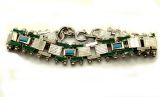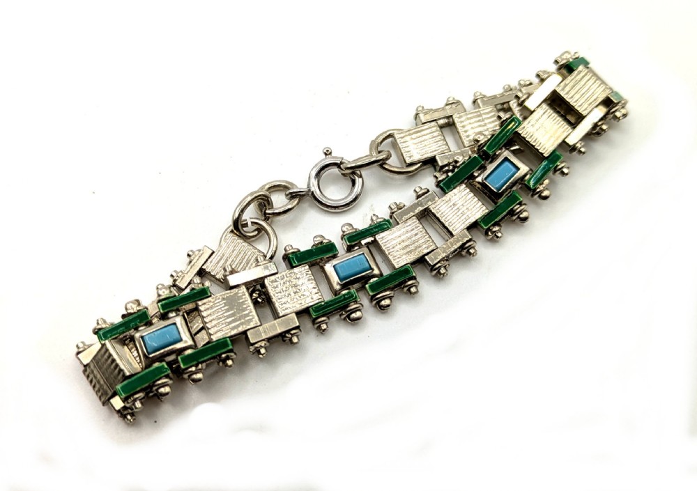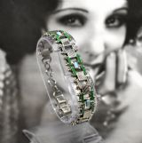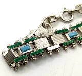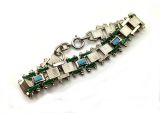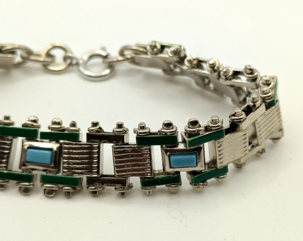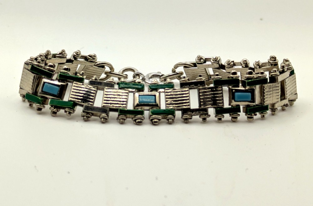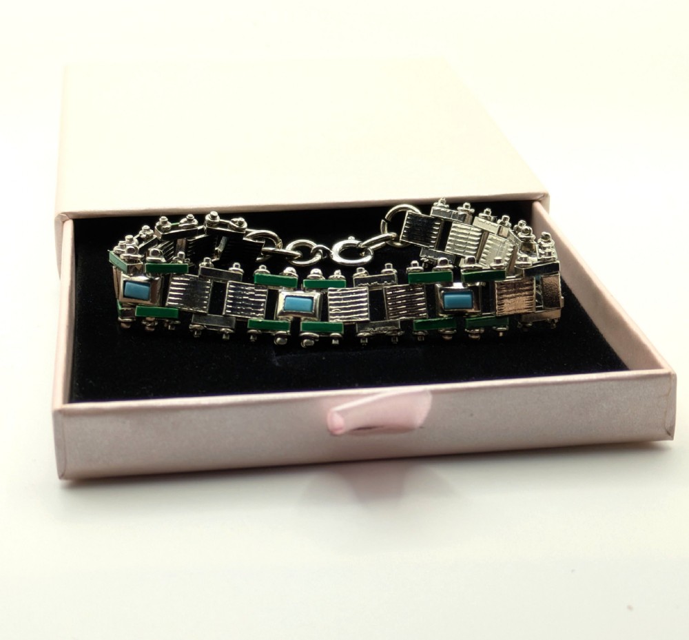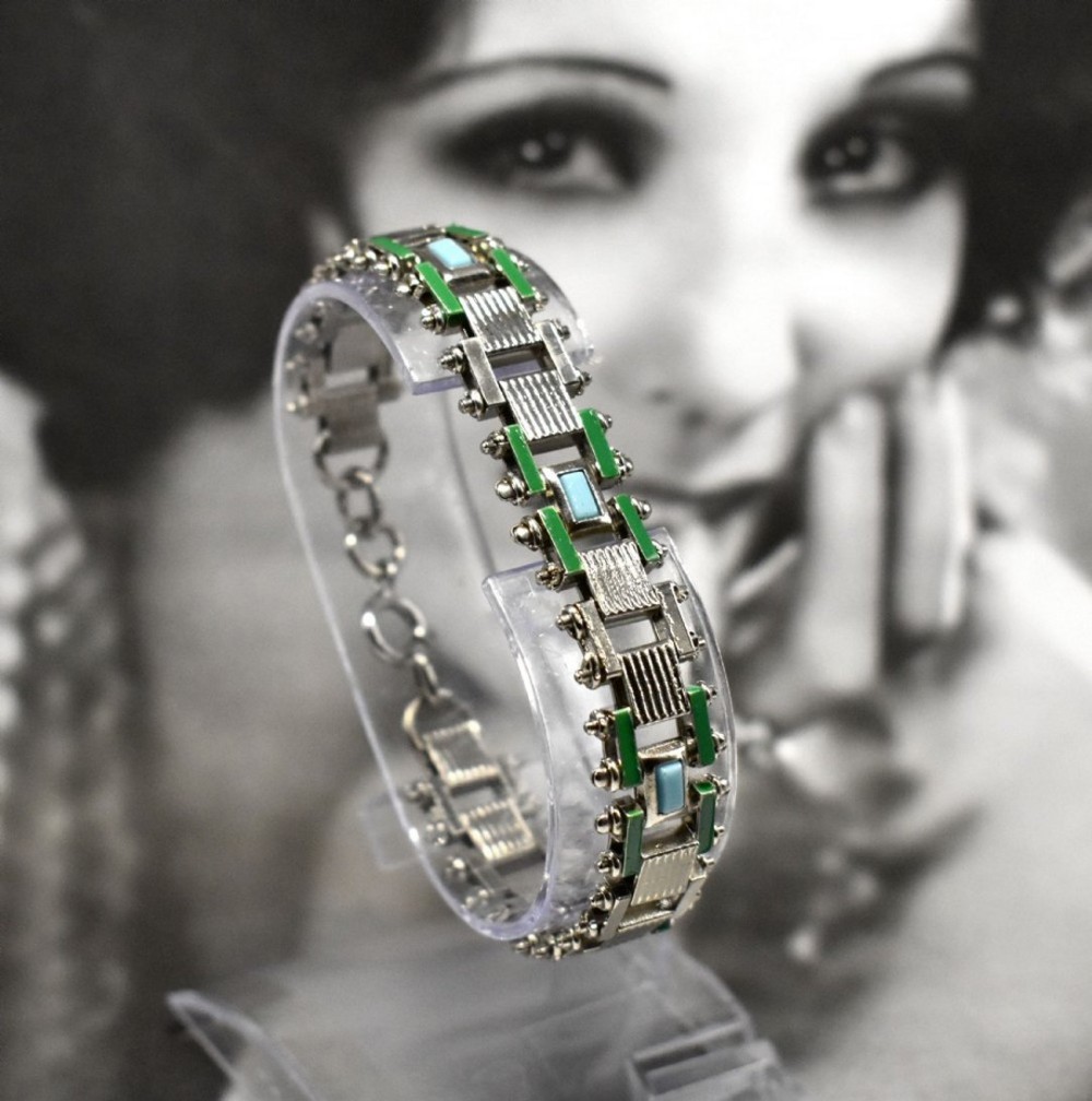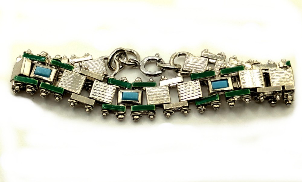 For your consideration is this rather stylish Art Deco ladies bracelet from the German maker Jakob Bengel. Dating to the 1930's and so advanced for it's time in it's design that one could be forgiven for not recognising it as a period piece. One of the leading manufacturers of Art Deco jewellery, the company produced in the 1920's and 1930's very innovative and individual pieces, aesthetically characterised by their unique designs and modernist slant. This alternating patterned bracelet is quite weighty and is segmented with engine turned pieces linked with in chrome of green & pale blue enamel accents. Condition is excellent with little to no signs of it's true age. This piece could be old/new stock that's not been worn or used such is the condition, a rare find indeed. Ideal for day or evening wear for the fashion savvy lady of today. Size will fit most ladies wrists of today with an overall length 17 cm. All of our Jewellery and watches are sent out first class in a complimentary gift/presentation box. FREE UK MAINLAND DELIVERY Visit www.artdecoworld.co.uk for hundreds more wonderful Art Deco items to choose from. About Jakob Bengel Jakob Bengel was a chain and costume jewellery factory, founded by Jakob Bengel in 1873 in Idar-Oberstein, Germany. Until 1920, the company specialised in the production of watch chains and chatelaines. In the 1920's and 1930's, it became one of the leading manufacturers of fashion jewellery in the Art Deco style UK customers: we want you to be delighted with your purchases from us and so we offer a full money back guarantee (items must be returned within 14 days in same condition as when sent) if you are not fully satisfied with your purchases from us for what ever reason and would like to return them. Please note : Shipping costs are not refundable. Refunds are only issued once an item has been returned back to us. Refunds are issued within 48 hours in receipt of return.