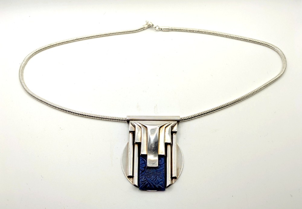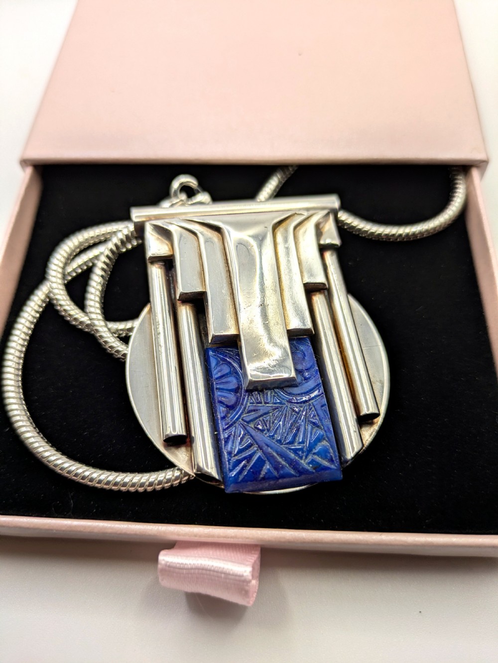 Fabulous Modernist statement necklace with the most desirable and exquisite detailing and craftsmanship, if you love Art Deco then this should be making your heart skip a beat. Features a royal blue lapis coloured centrepiece which is made from Galalith a type of bakelite that gives the impression of a lapis stone. The central pendant which is on a back panel is silver plated, the chain is chrome plated. FREE UK MAINLAND DELIVERY Visit www.artdecoworld.co.uk for hundreds more wonderful Art Deco items to choose from. UK customers: we want you to be delighted with your purchases from us and so we offer a full money back guarantee (items must be returned within 14 days in same condition as when sent) if you are not fully satisfied with your purchases from us for what ever reason and would like to return them. Please note : Shipping costs are not refundable. Refunds are only issued once an item has been returned back to us. Refunds are issued within 48 hours in receipt of return.
