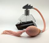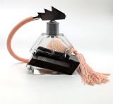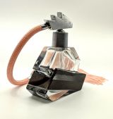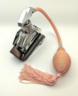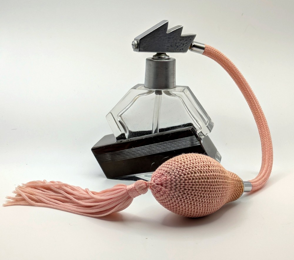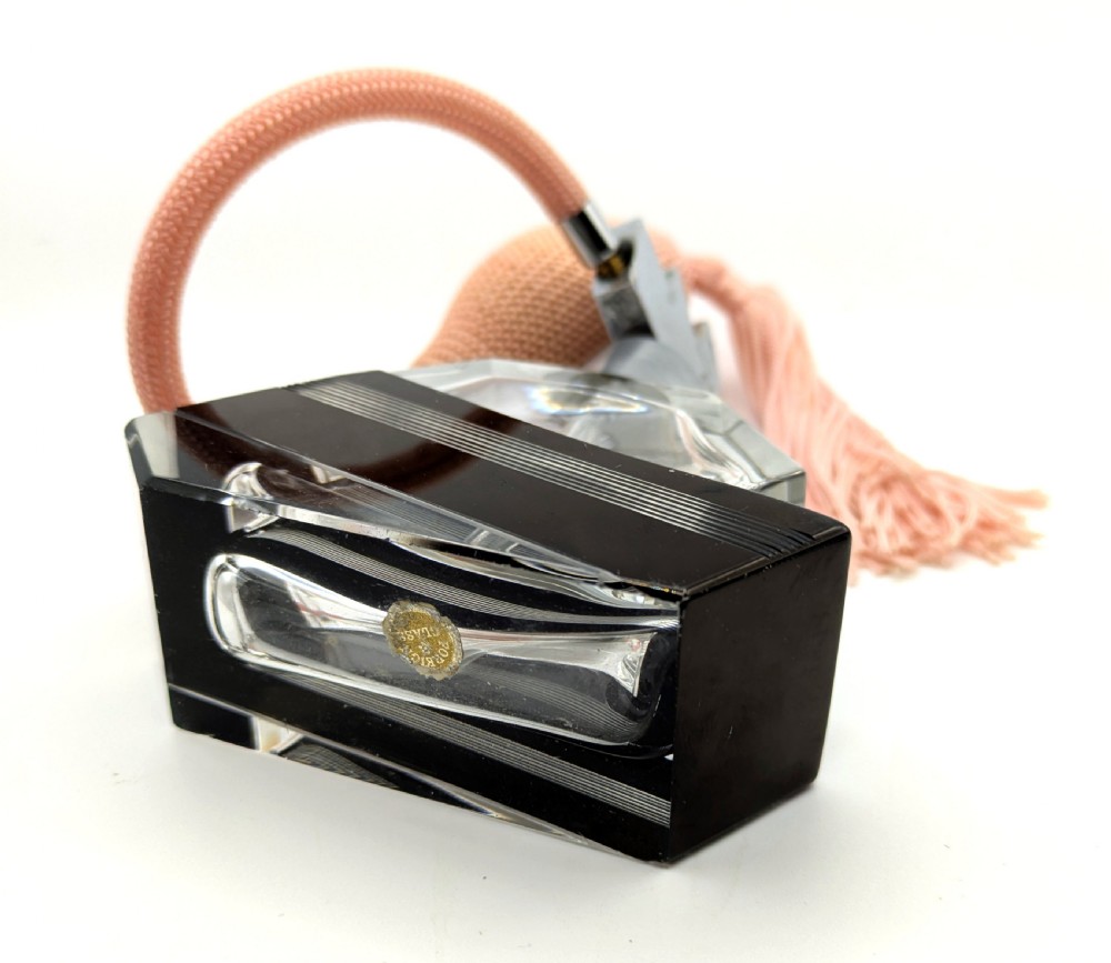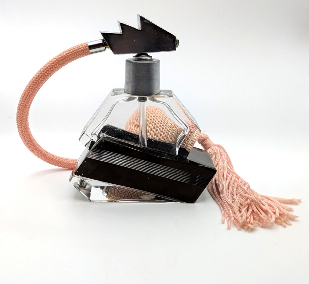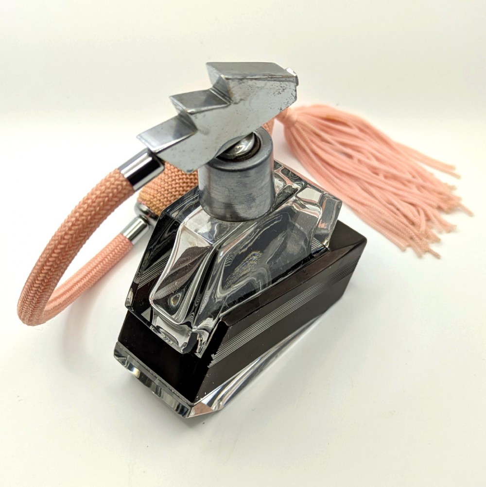 Art Deco Czech perfume atomiser dating from the 1930s. Clear glass with chromed metal, with a fabulous geometric lightening shape & design in black enamel and contrasting frosted glass . The bottle is an angled, stepped shape and comes with a pink atomiser bulb & tassel - can't be mistaken for any other era can it ! The vintage puffer bulb works perfectly ( blows a good jet of air through) . Would look great displayed on an Art Deco dressing table; Altogether, a very desirable Art Deco 1930s period glass perfume bottle In good vintage condition. The chrome plating is still shiny but does have some signs of use There are some scratches to the black enamel on one side, nothing to distract and expected wear for a bottle this age. No oxidisation to the enamelling, everything is bright and crisp. FREE UK MAINLAND DELIVERY Visit www.artdecoworld.co.uk for hundreds more wonderful Art Deco items to choose from. UK customers: we want you to be delighted with your purchases from us and so we offer a full money back guarantee (items must be returned within 14 days in same condition as when sent) if you are not fully satisfied with your purchases from us for what ever reason and would like to return them. Please note : Shipping costs are not refundable. Refunds are only issued once an item has been returned back to us. Refunds are issued within 48 hours in receipt of return.