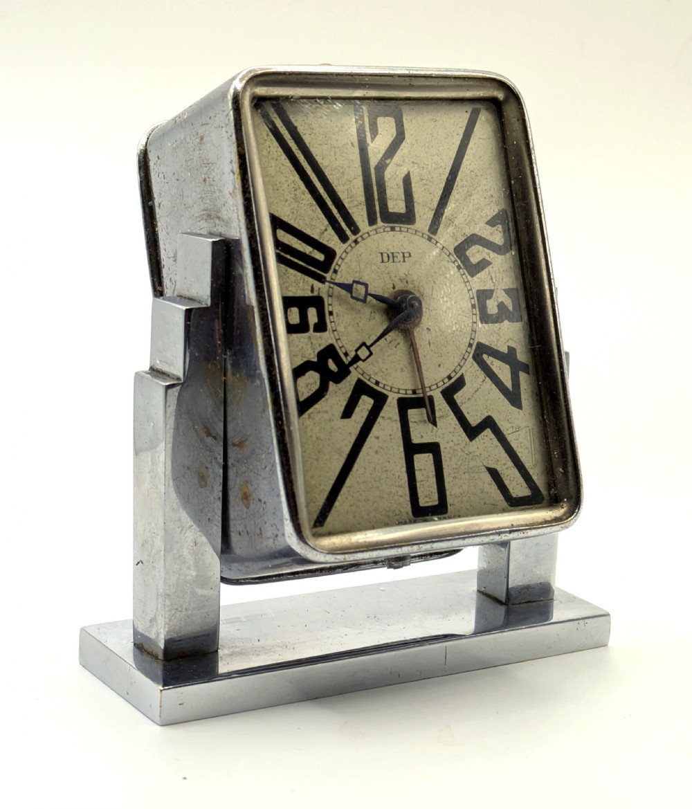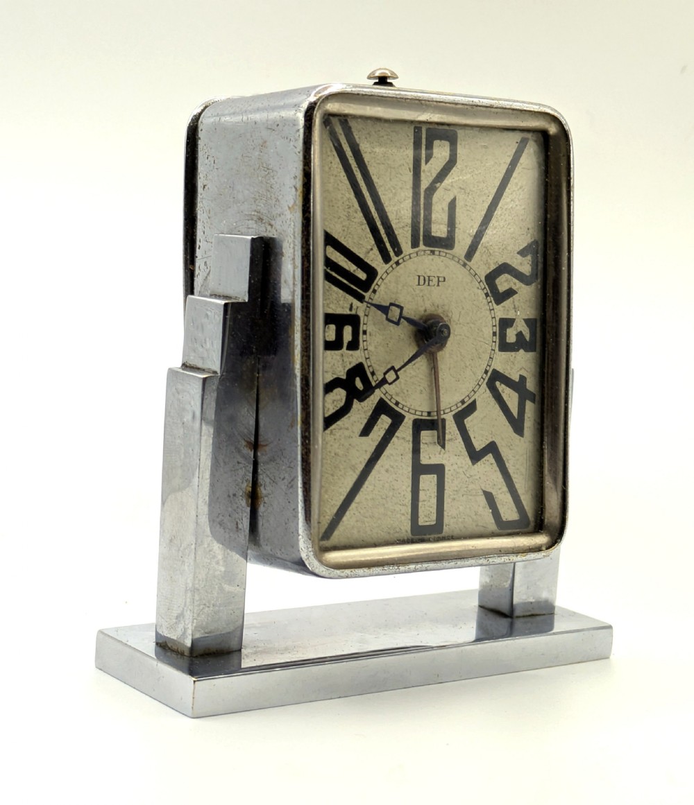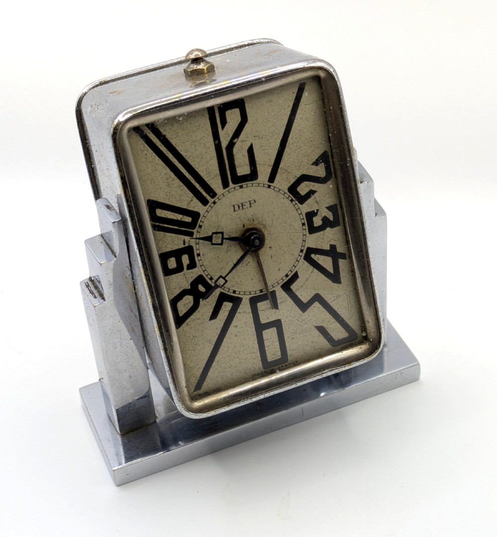 Made by the renowned French maker DEP ~ from the Depary family name, who flourished in the Art Deco era of the 1920s and 30s. Also marketed at this time to stand for Durée, Elegance and Precision. Mechanical wind-up movement with separate alarm wind. Very stylish skyscraper shape, with Lovely clear face with it's superb Art Deco stylised elongated numerals that can't be mistaken for any other era. Age-related wear and patina to the dial and chrome, consistent with age. Fully serviced by a qualified horologist. Beautiful quality and lovely little clock & very evocative of the Art Deco period. The new owner will not be disappointed. FREE UK DELIVERY
