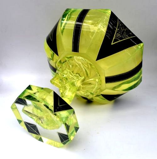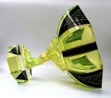 Standing approx 9" tall is this superbly stylish Art Deco comport. Originating from Czech republic and obviously influenced by Karl Palda this comport packs two punches, not only visually with it's very distinctive green / yellow colouring with added jet black enamel accents/design but the pure size of it which stands 23 cm high and 25cm in diameter. The glass is extremely thick and therefore the comport itself is very very heavy. The shape is extremely unusual, the column which supports the large bowl top features a nude female encircling to create the column. The most common colour of uranium glass is pale yellowish-green, which in the 1930s led to the nickname "Vaseline glass" based on a perceived resemblance to the appearance (which was a yellow-green colour) of Vaseline brand petroleum jelly as formulated and commercially sold at that time. This piece definitely won't disappoint, we defy the new owner not to fall in love it. Condition is excellent, can't find any damage or flaws to note. This is the second one we've ever had of this design in the last 15 years, so reasonably rare. UK customers: we want you to be delighted with your purchases from us and so we offer a full money back guarantee (items must be returned within 14 days in same condition as when sent) if you are not fully satisfied with your purchases from us for what ever reason and would like to return them. Please note : Shipping costs are not refundable. Refunds are only issued once an item has been returned back to us. Refunds are issued within 48 hours in receipt of return.