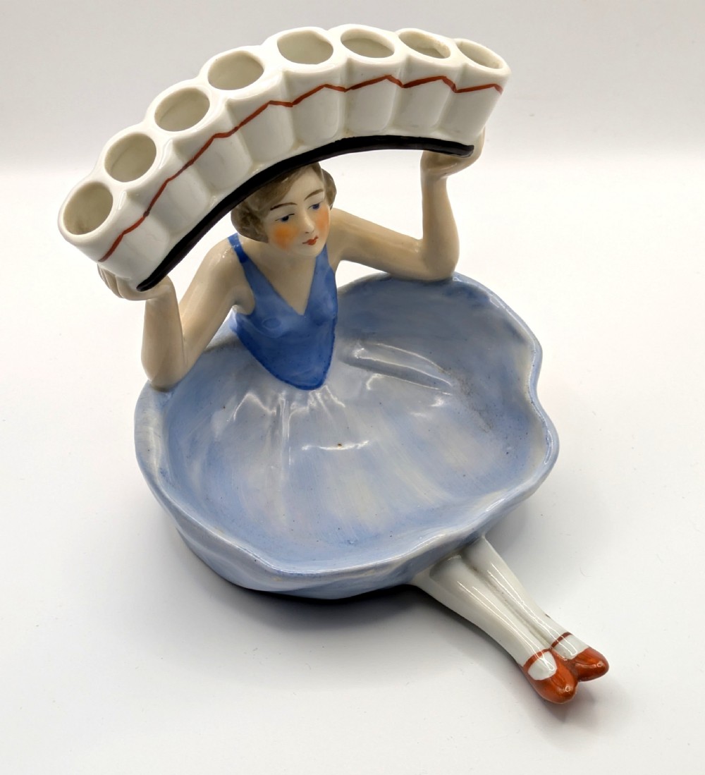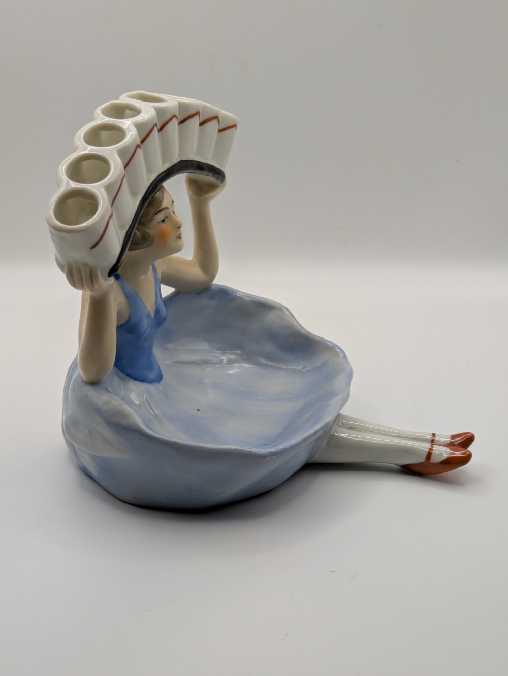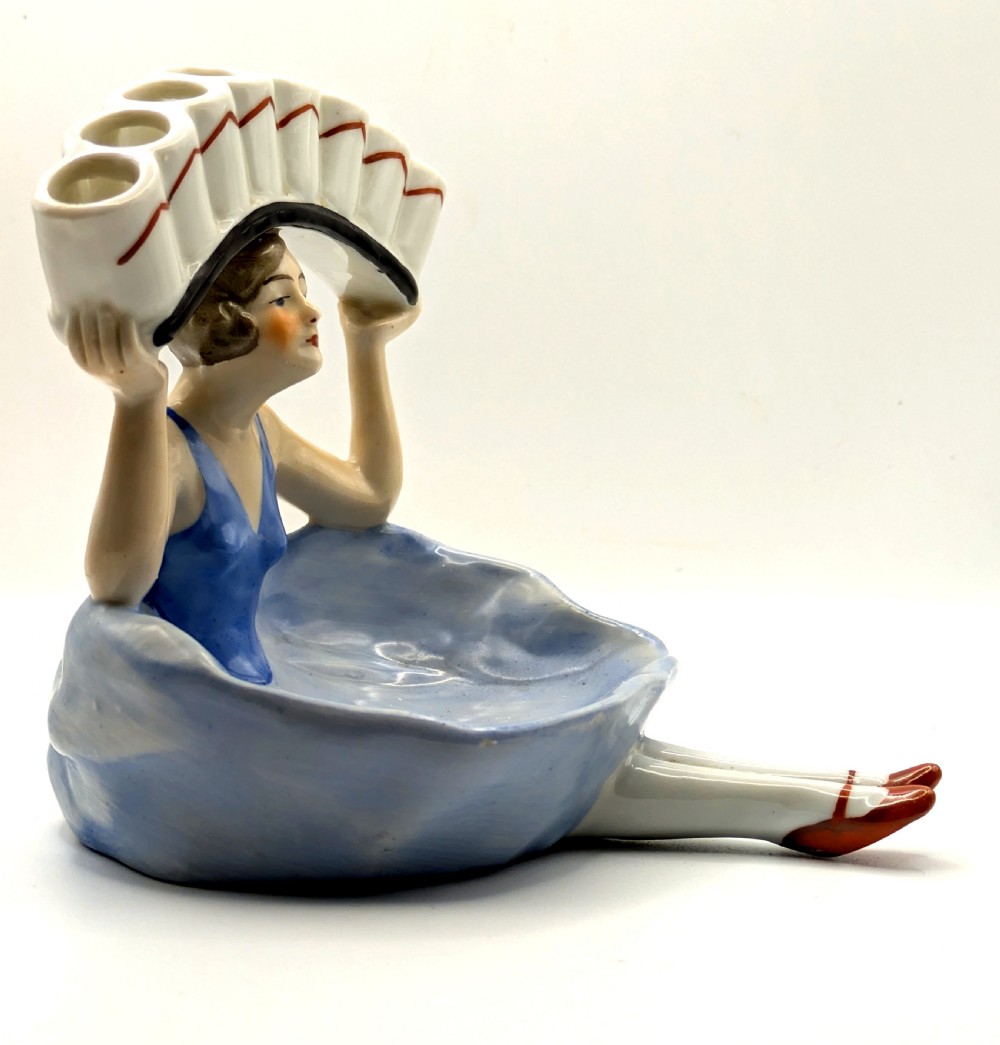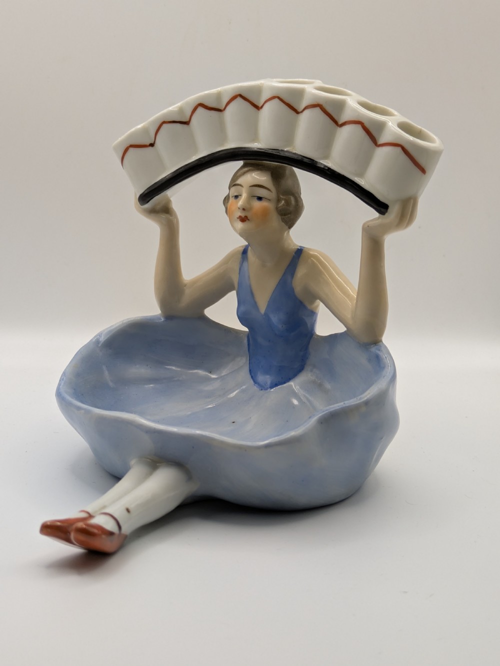 For your consideration is this extremely rare and very enchanting porcelain bisque cigarette holder match striker dating to the 1930s and sourced in France. Depicting a flapper girl sat holding a fan short vessels that operate as cigarette holder. She's dressed in the fashion of the day with a crimped bob haircut. The attention to detail is just wonderful, so skillfully painted, from her slightly blushed cheeks to her dress, everything about this piece screams quality and at every angle she looks amazing. Behind the figure is an unpainted vanish area which is made for striking a match. Her dress works as an ashtray, of course it can also be used as a pin tray or card holder for modern day use. She's larger than usual and so makes a great piece for display. This is one of our personal favourite pieces, she won't disappoint and comes in great condition free from any damage or restoration. FREE UK MAINLAND DELIVERY UK customers: we want you to be delighted with your purchases from us and so we offer a full money back guarantee (items must be returned within 14 days in same condition as when sent) if you are not fully satisfied with your purchases from us for what ever reason and would like to return them. Please note : Shipping costs are not refundable. Refunds are only issued once an item has been returned back to us. Refunds are issued within 48 hours in receipt of return.