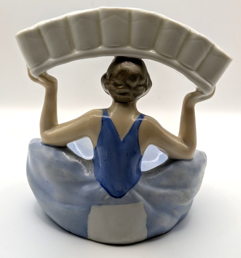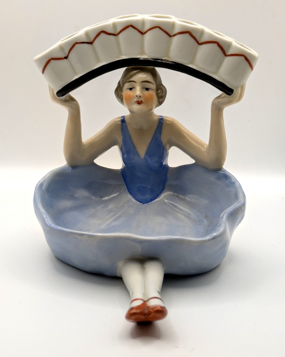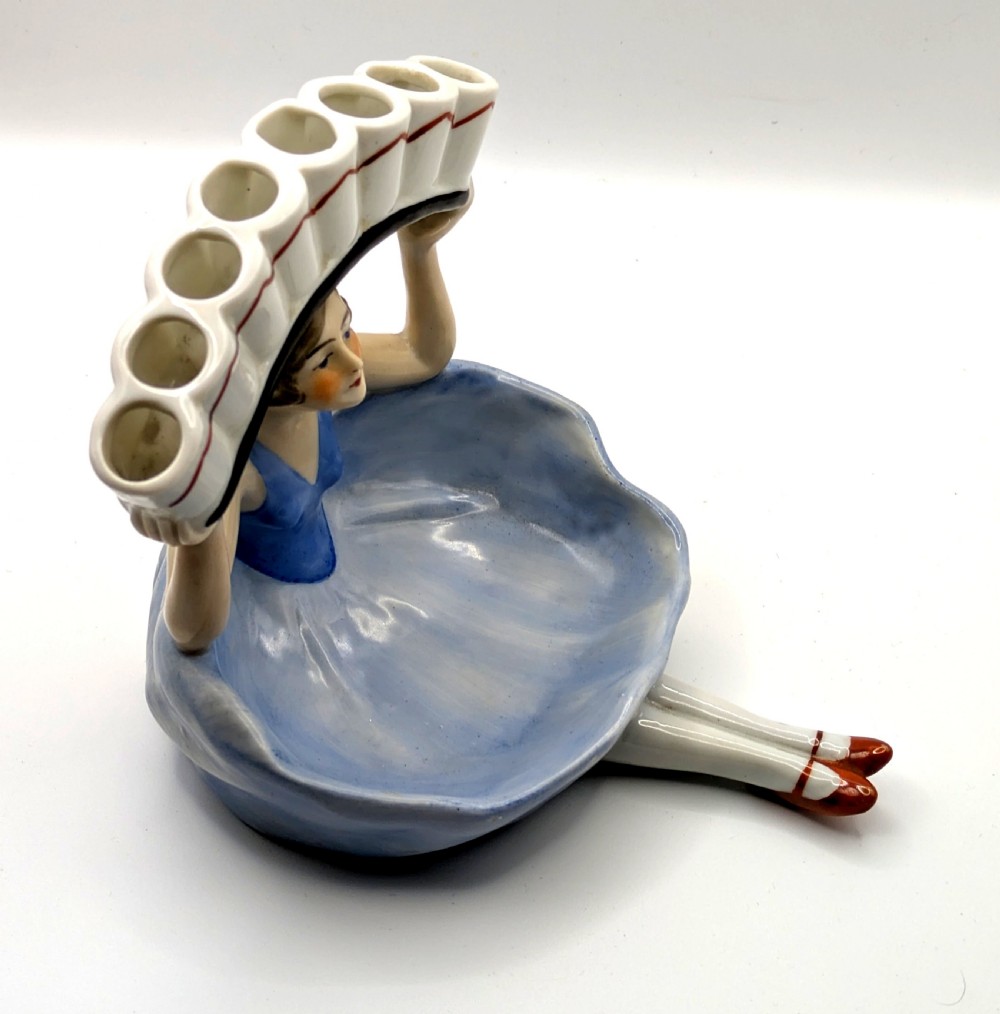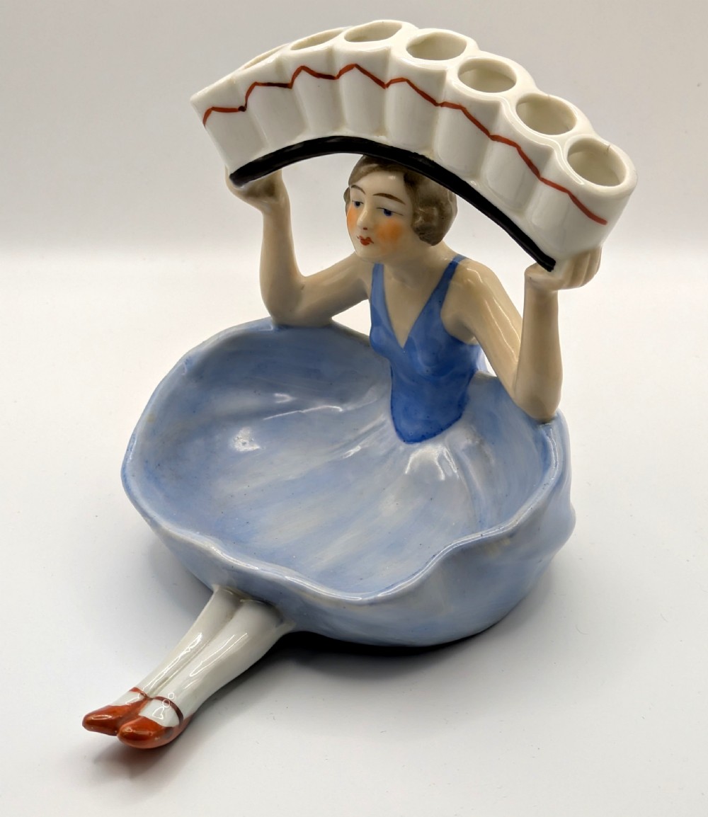 For your consideration is this extremely rare and very enchanting porcelain bisque cigarette holder match striker dating to the 1930s and sourced in France. Depicting a flapper girl sat holding a fan short vessels that operate as cigarette holder. She's dressed in the fashion of the day with a crimped bob haircut. The attention to detail is just wonderful, so skillfully painted, from her slightly blushed cheeks to her dress, everything about this piece screams quality and at every angle she looks amazing. Behind the figure is an unpainted vanish area which is made for striking a match. Her dress works as an ashtray, of course it can also be used as a pin tray or card holder for modern day use. She's larger than usual and so makes a great piece for display. This is one of our personal favourite pieces, she won't disappoint and comes in great condition free from any damage or restoration. FREE UK MAINLAND DELIVERY UK customers: we want you to be delighted with your purchases from us and so we offer a full money back guarantee (items must be returned within 14 days in same condition as when sent) if you are not fully satisfied with your purchases from us for what ever reason and would like to return them. Please note : Shipping costs are not refundable. Refunds are only issued once an item has been returned back to us. Refunds are issued within 48 hours in receipt of return.