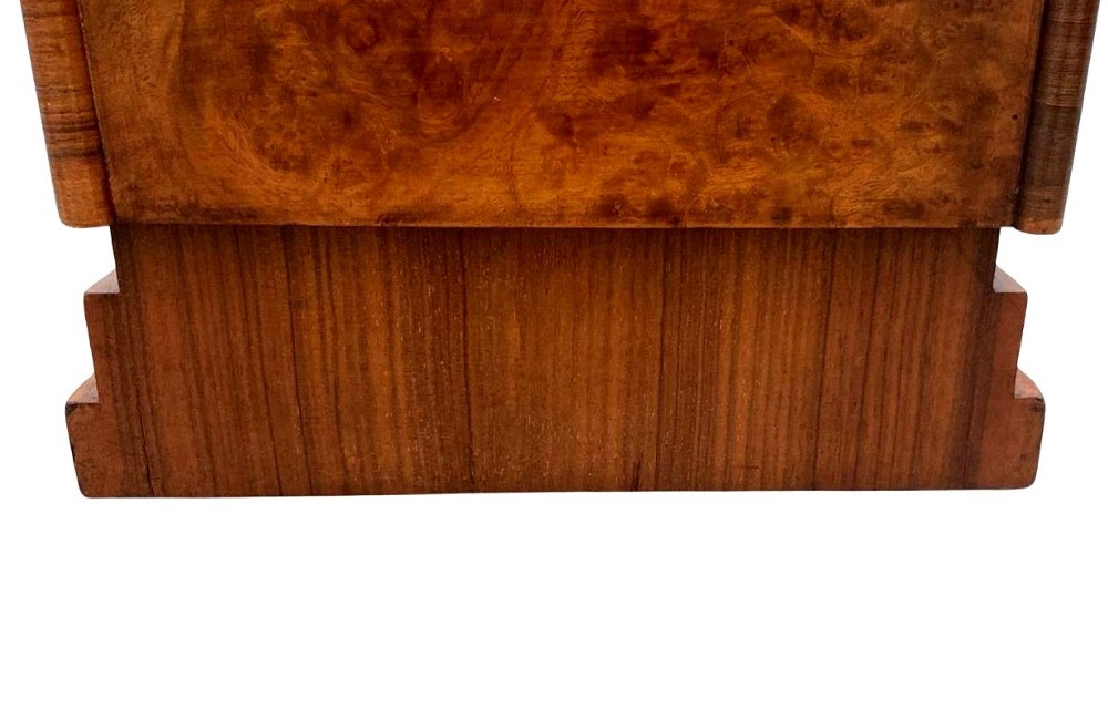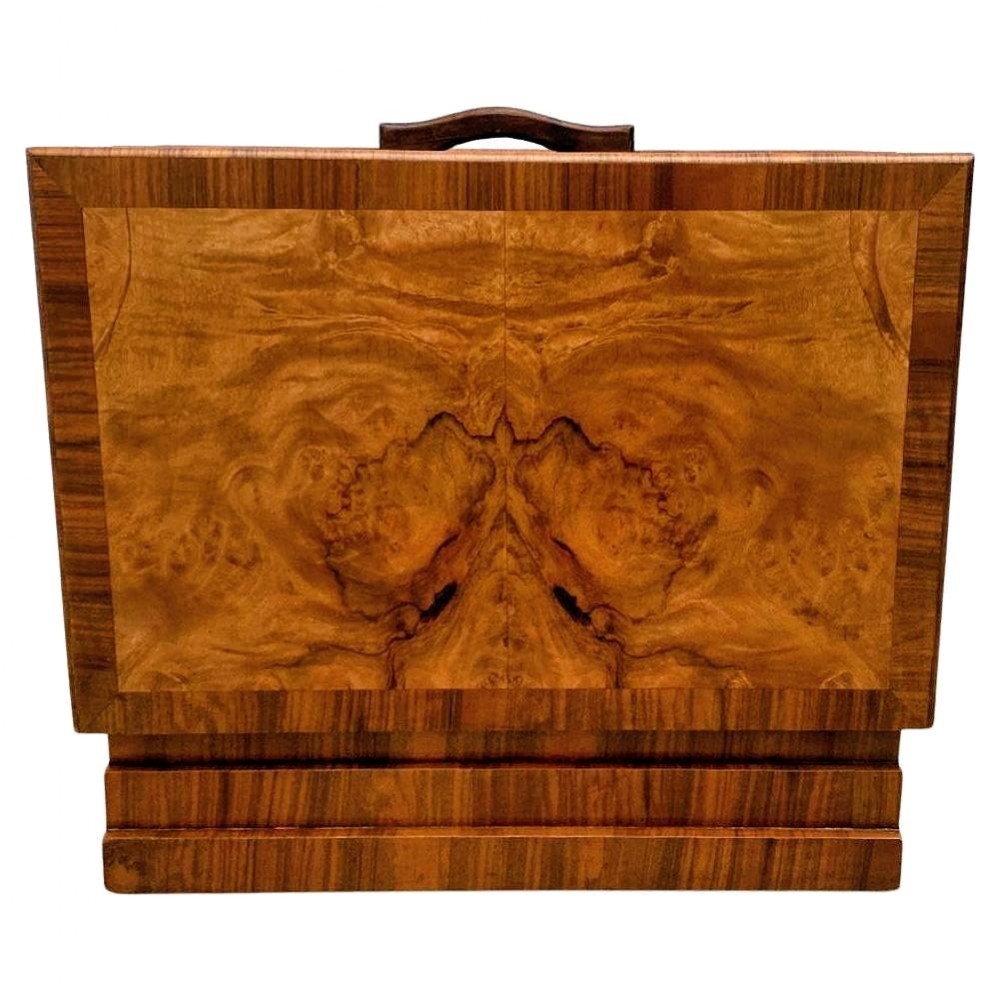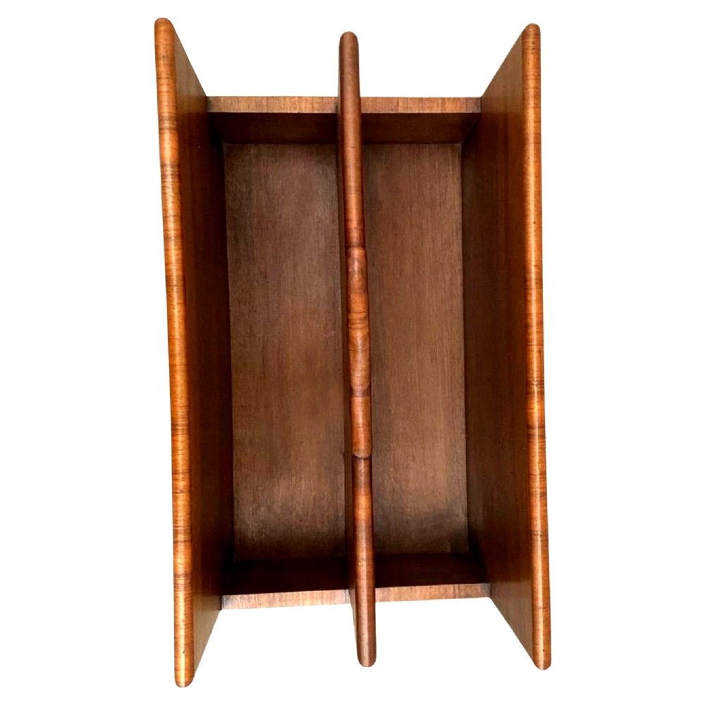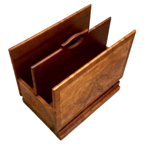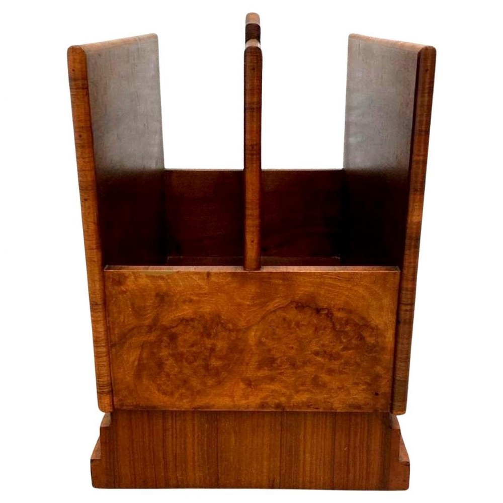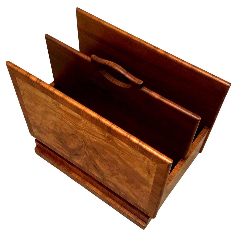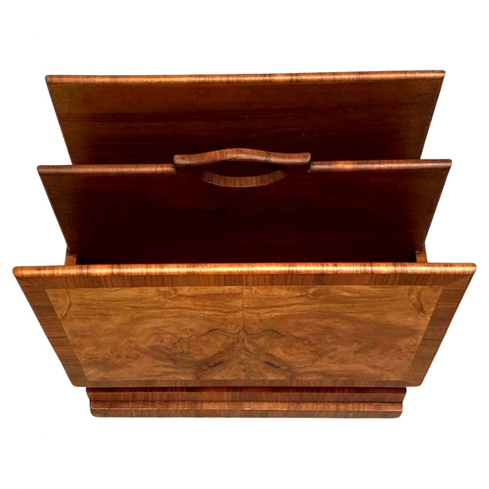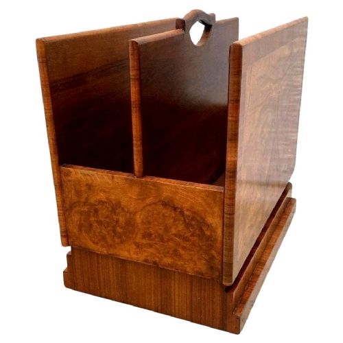 For your consideration is this rather charming and relatively rare Art Deco magazine rack. We've rarely ever had these in stock and as they really don't exist in great numbers. This is a superb example that has been lovingly looked after over the last 95 odd years. Very sturdy and robust and perfect size for modern day use this rack boasts not only functionality but a genuine kerb side appeal. Beautifully figured walnut veneers with walnut feather banding to the edges. There are two compartments to house your reading material wide enough to house books as well as paperwork / magazines. A useful carry handle offers the choice to move it to different areas of a room with ease. We've taken this piece through our workshops and given it a light polish. There are no flaws to note, it's free from chips of veneer, discolouration and all the usual suspects giving away it's age and use.