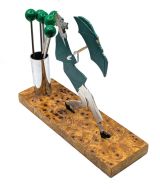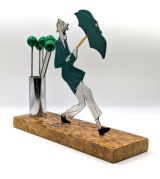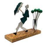 Original French charming novelty cocktail stick set unsigned by SUDRE with 6 green bakelite and chrome cocktail sticks. Depicts an man battling against the wind with his umbrella. These sets are rare and highly sought after, dating from the 1930s. All on walnut base . It is in great condition for its age with no damage. A very charming and wonderful talking point to add to your cocktail cabinet or bar cart. FREE UK DELIVERY UK customers: we want you to be delighted with your purchases from us and so we offer a full money back guarantee (items must be returned within 14 days in same condition as when sent) if you are not fully satisfied with your purchases from us for what ever reason and would like to return them. Please note : Shipping costs are not refundable. Refunds are only issued once an item has been returned back to us. Refunds are issued within 48 hours in receipt of return.