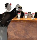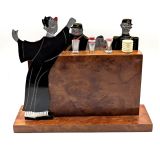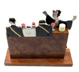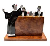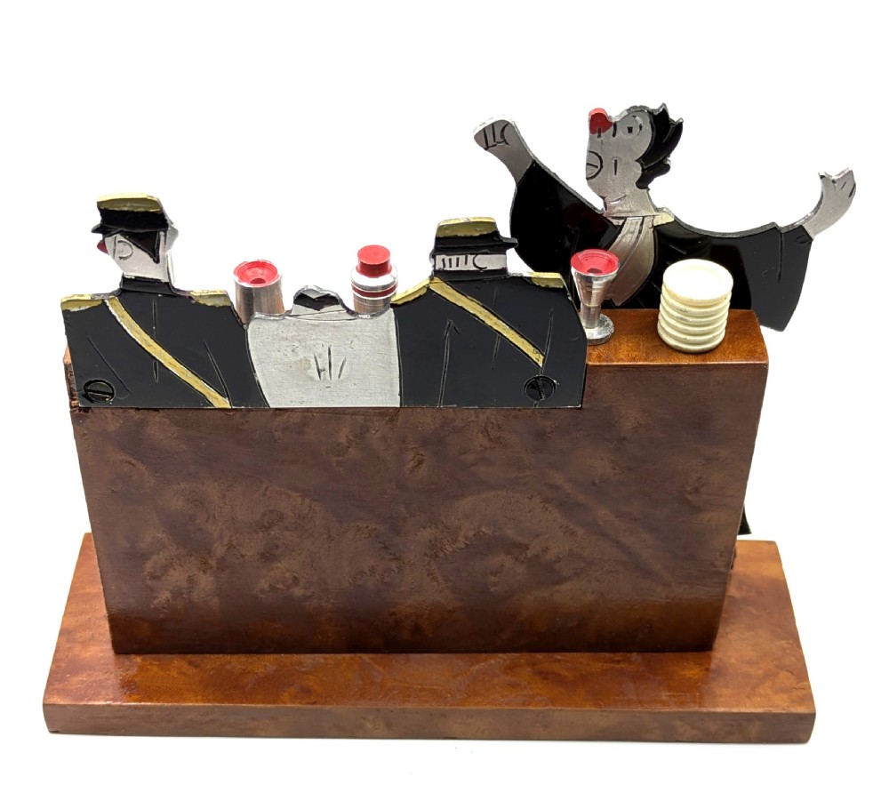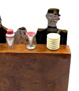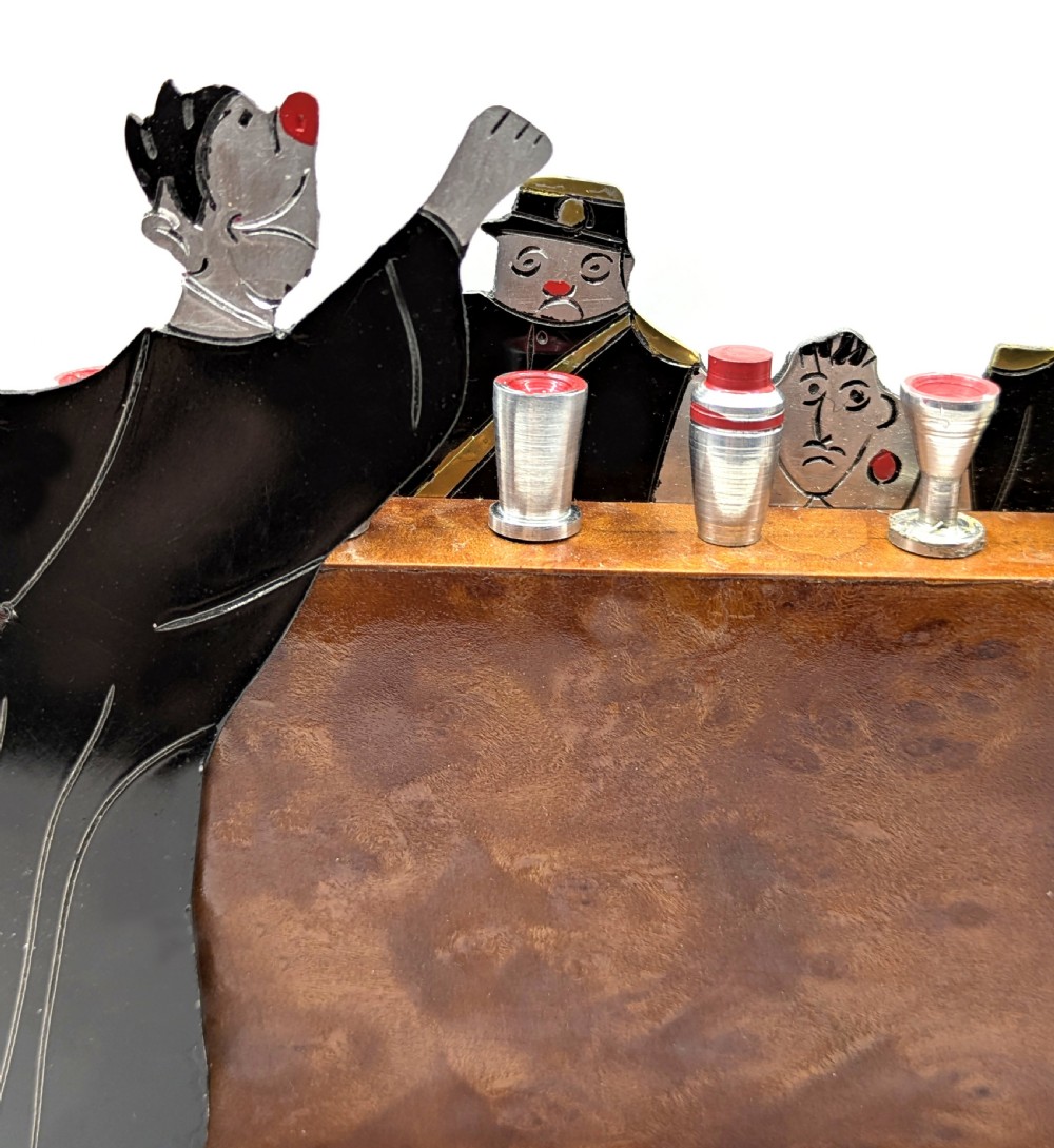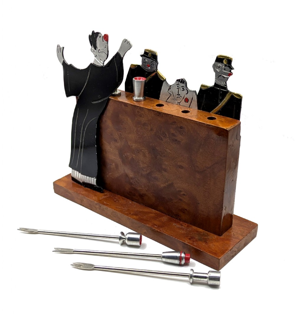 Original French charming novelty cocktail stick set signed by SUDRE with 6 chrome cocktail sticks. Depicts The judge sentencing a convict with two glum looking policemen by his side. Chrome vessels and one bakelite ice bucket act as 6 chrome cocktail sticks when pulled out from the bar. These sets are rare and highly sought after, dating from the 1930s. All on a walnut bar and base . It is in great condition for its age with no damage. A very charming and wonderful talking point to add to your cocktail cabinet or bar cart.