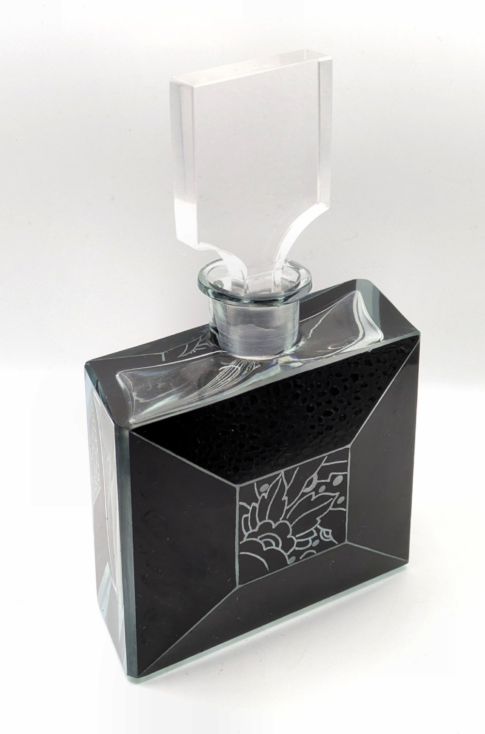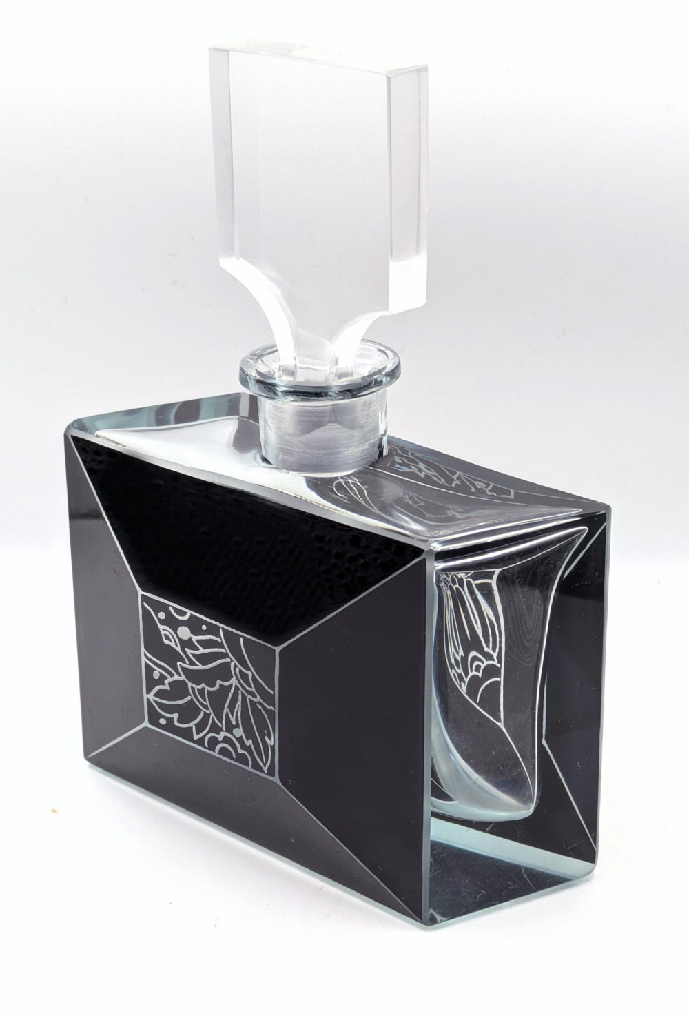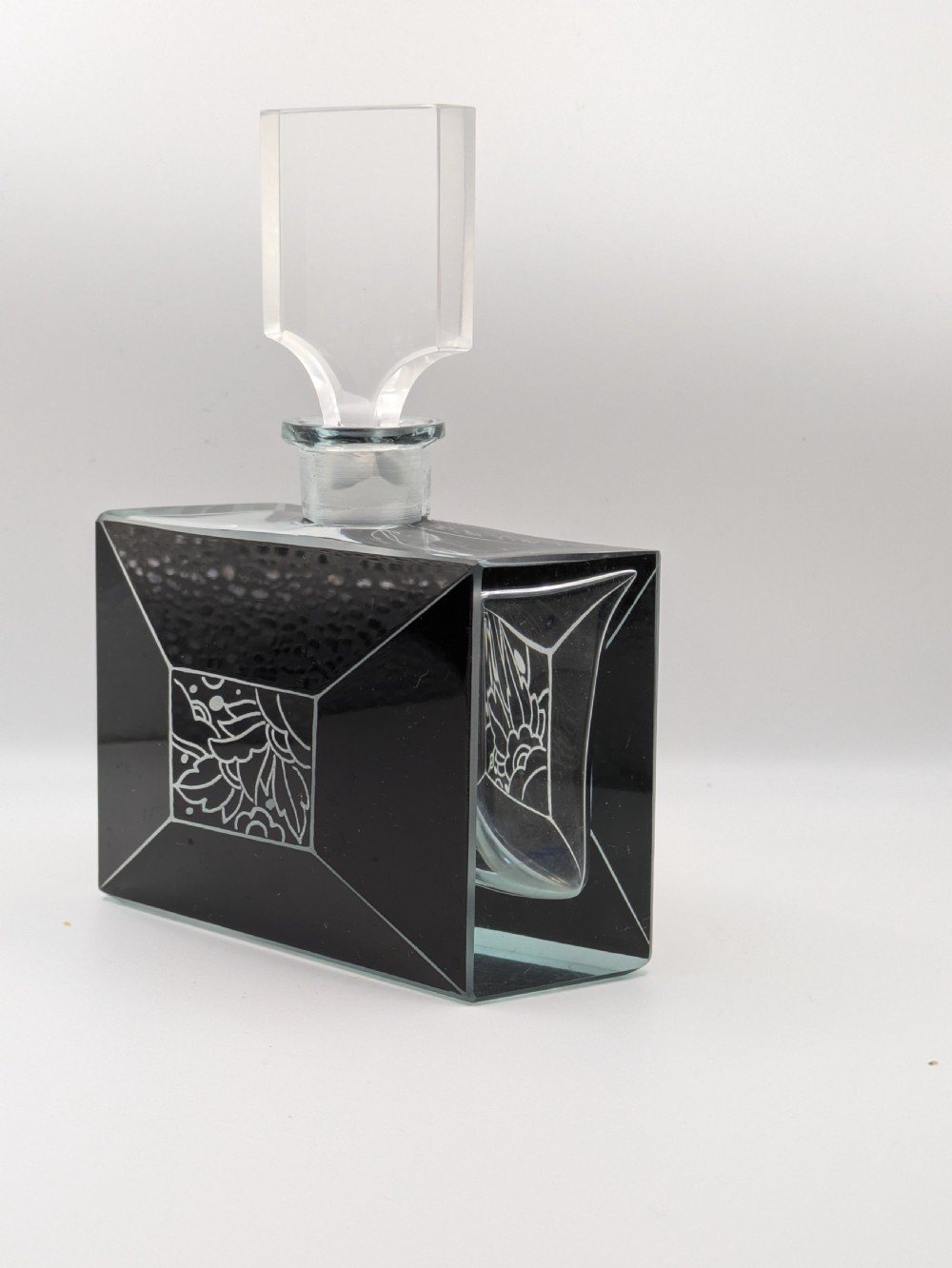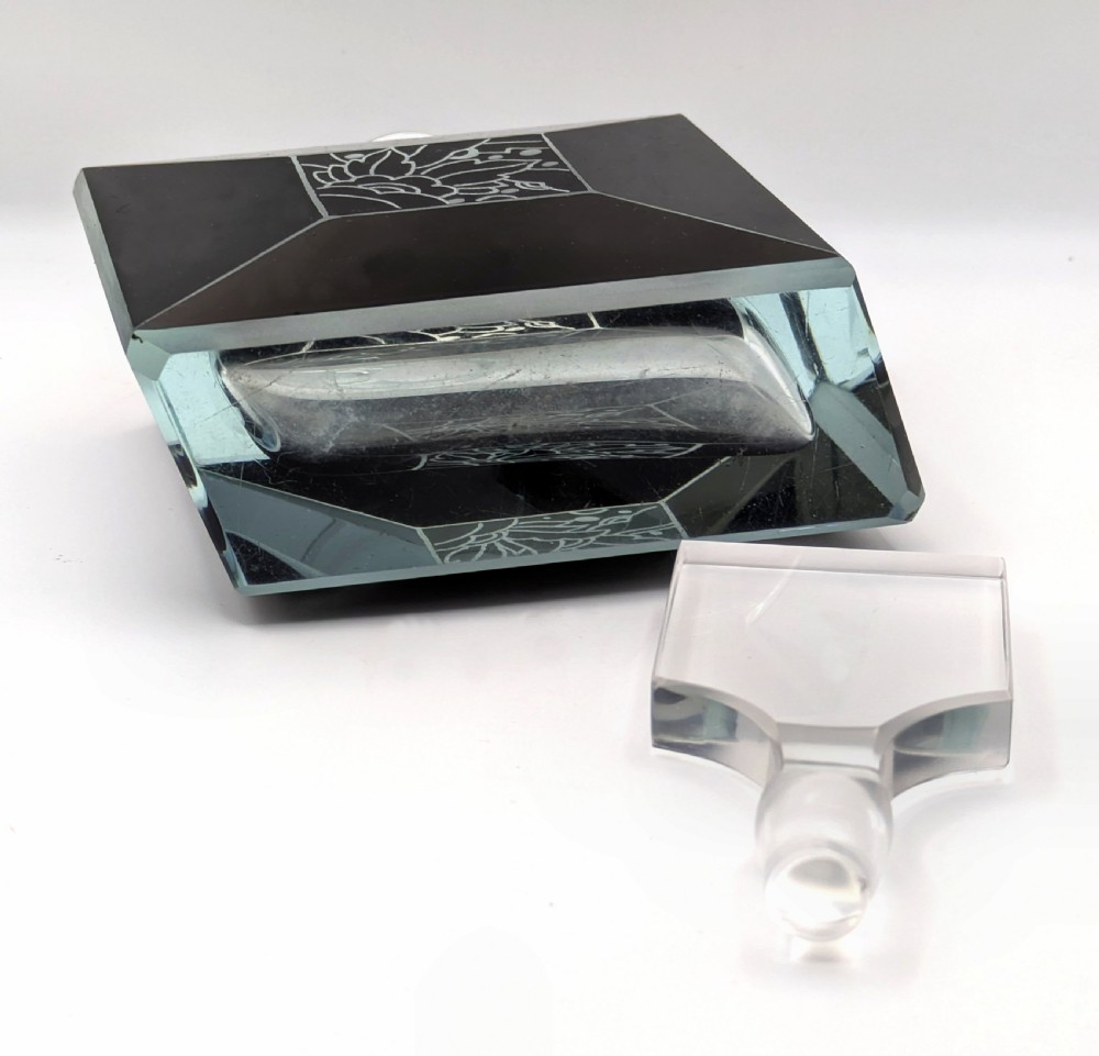 For your consideration is this wonderful 1930s Art Deco glass perfume bottle, it's an absolute beauty and such a rare find. Black enamel with etched glass in geometric forms makes up the decoration to the exterior of the bottle and it's stopper, Very much in the style of Karl Palda. Excellent condition with no flaws to note except for some very minor surface scratches on the base of the bottle. Displays beautifully and would be an asset to any bathroom or bedroom setting. Free UK mainland delivery UK customers: we want you to be delighted with your purchases from us and so we offer a full money back guarantee (items must be returned within 14 days in same condition as when sent) if you are not fully satisfied with your purchases from us for what ever reason and would like to return them. Please note : Shipping costs are not refundable. Refunds are only issued once an item has been returned back to us. Refunds are issued within 48 hours in receipt of return.