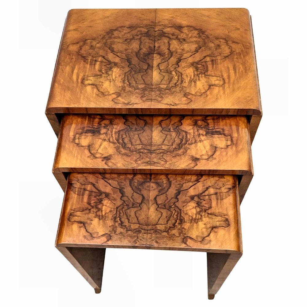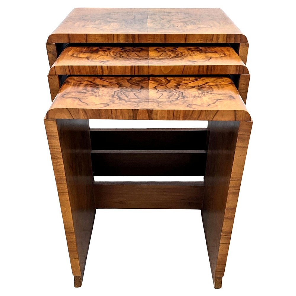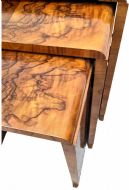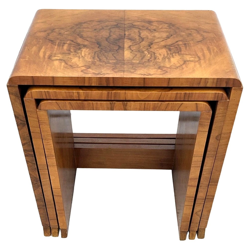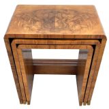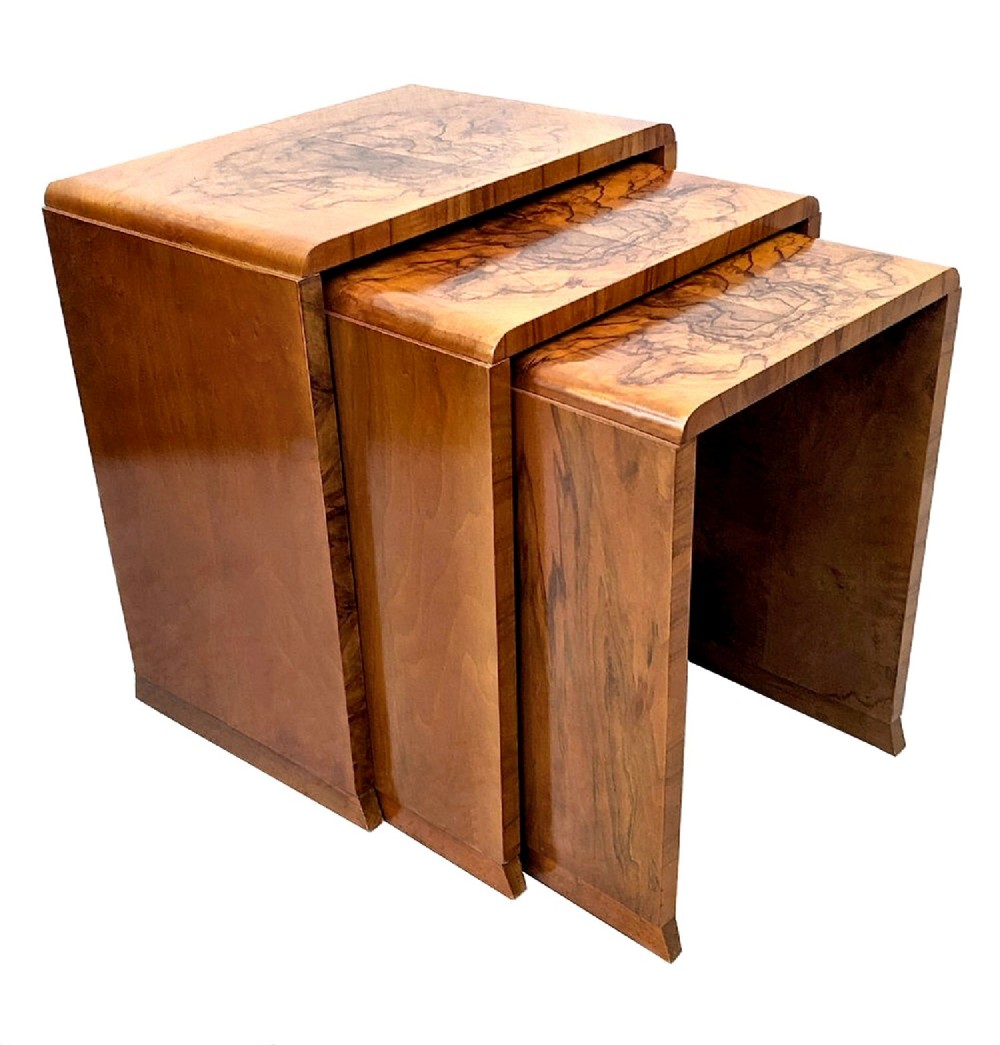 A very stylish and distinctive Art Deco nest of walnut tables dating to the 1930s and made by H & L Epstein a highly regarded furniture maker of the period. One large table with two further tables in tiered sizes that snugly fit underneath each other. Each table is sturdy in it's construct and will work perfectly for modern day use. Lovely warm colouring with the most exquisite walnut figured veneers. A rare classic set to enhance your home interior. The whole set has been fully and professionally restored and is in good vintage condition. Images taken in natural daylight. FREE UK mainland delivery UK customers: we want you to be delighted with your purchases from us and so we offer a full money back guarantee (items must be returned within 14 days in same condition as when sent) if you are not fully satisfied with your purchases from us for what ever reason and would like to return them. Please note : Shipping costs are not refundable. Refunds are only issued once an item has been returned back to us. Refunds are issued within 48 hours in receipt of return.