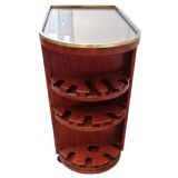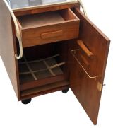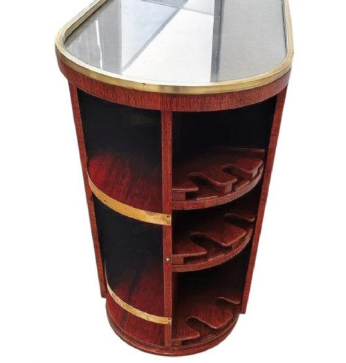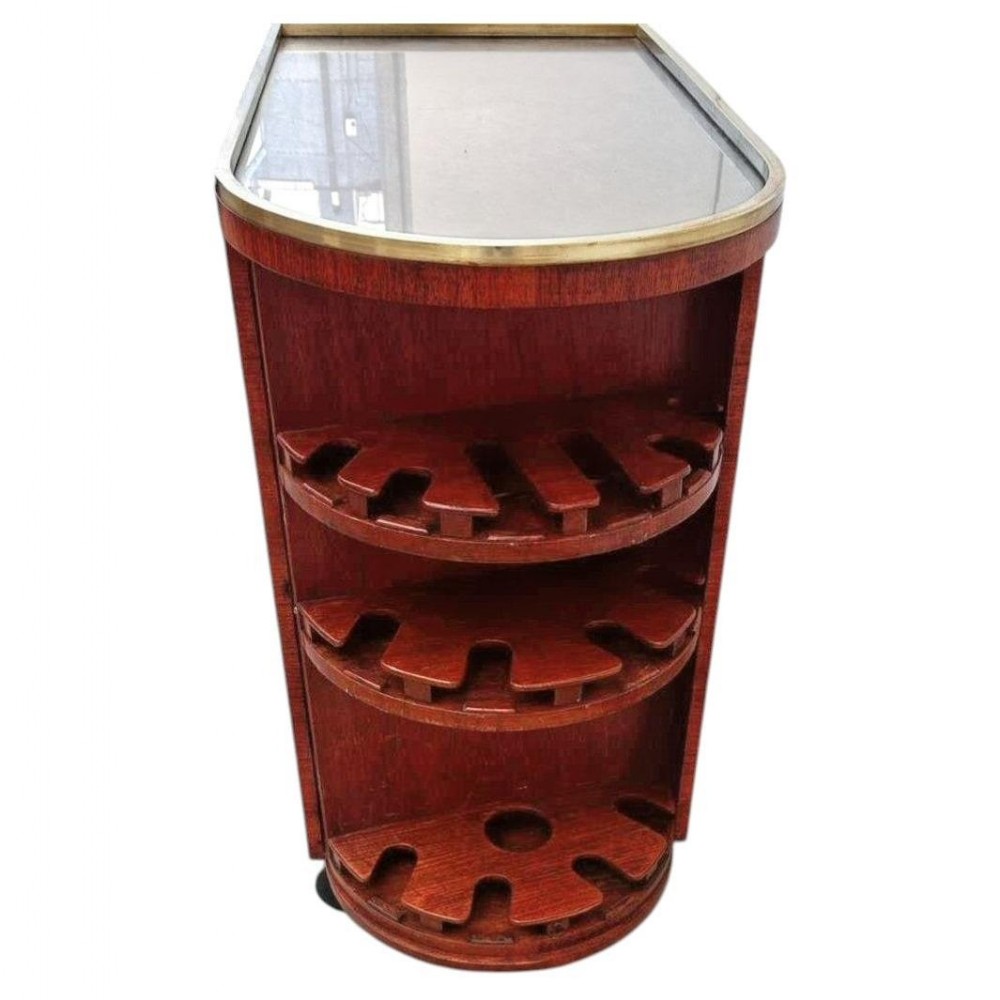 For your consideration is this superbly stylish and all original 1930's Art Deco bar cart, originating from France this wonderful cocktail trolley does not disappoint! Sourced just outside of Paris this cart was part of a private estate sale and had been in the family since new. Features a beautifully figured Burr Amboyna cabinet with lockable door a Mahogany interior which offers lots of space for storage of both bottled drinks and glasses. Further bottles can be stored on the open shelving on the exterior of the cart too and glasses. The brass tubular bars that encircle the cabinet offer that modernism and extra style. Comes with it's original key, a protective glass top and smooth operating casters ensuring the cart moves effortlessly. We've renovated the woodwork with French polish and cleaned the brass work so this piece is offered to you in very good restored condition and ready to be enjoyed. One end of the cart revolves offering open shelving and fretted out area to hold stem glasses. The top has a protective glass cover.