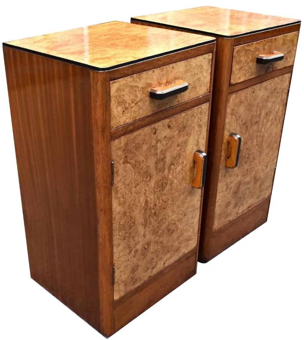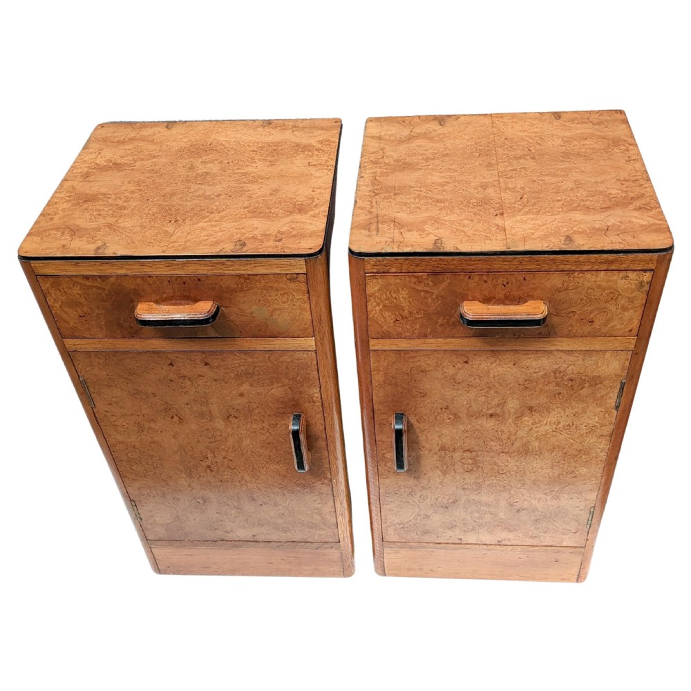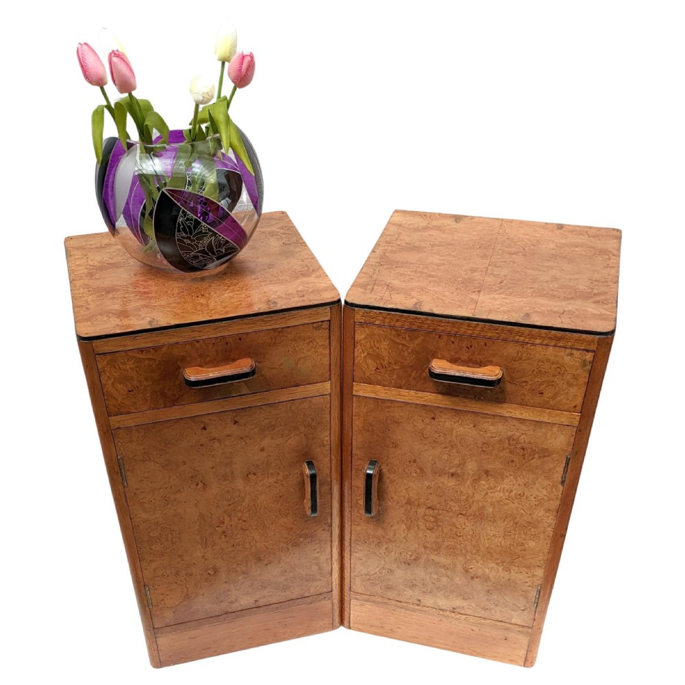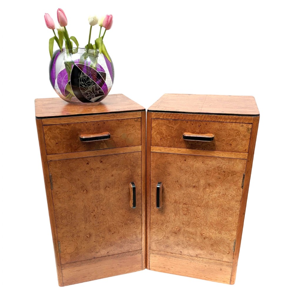 Fabulous pair of matching 1930's Art Deco bedside tables in heavily figured maple veneer with original ebonised wooden handles and ebonised accents. Two generously sized internal storage areas. Each cabinet has a pull out upper drawer which works effortlessly. We've had both cabinets fully and professionally restored and so come to you in very good condition. FREE UK mainland delivery UK customers: we want you to be delighted with your purchases from us and so we offer a full money back guarantee (items must be returned within 14 days in same condition as when sent) if you are not fully satisfied with your purchases from us for what ever reason and would like to return them. Please note : Shipping costs are not refundable. Refunds are only issued once an item has been returned back to us. Refunds are issued within 48 hours in receipt of return.