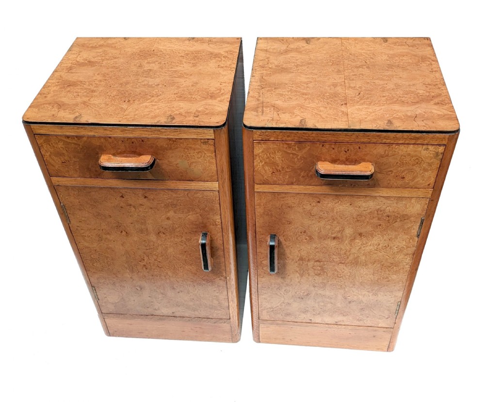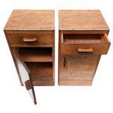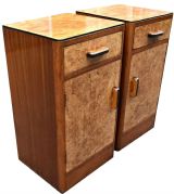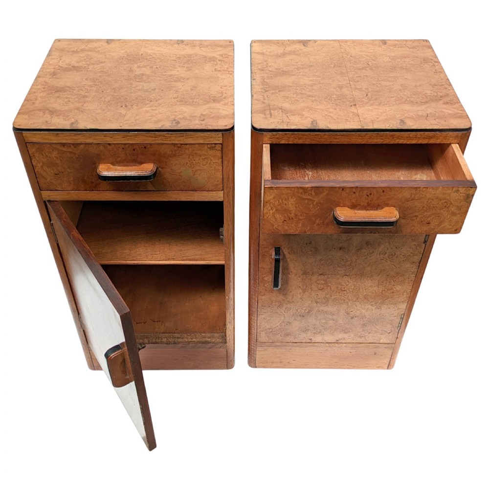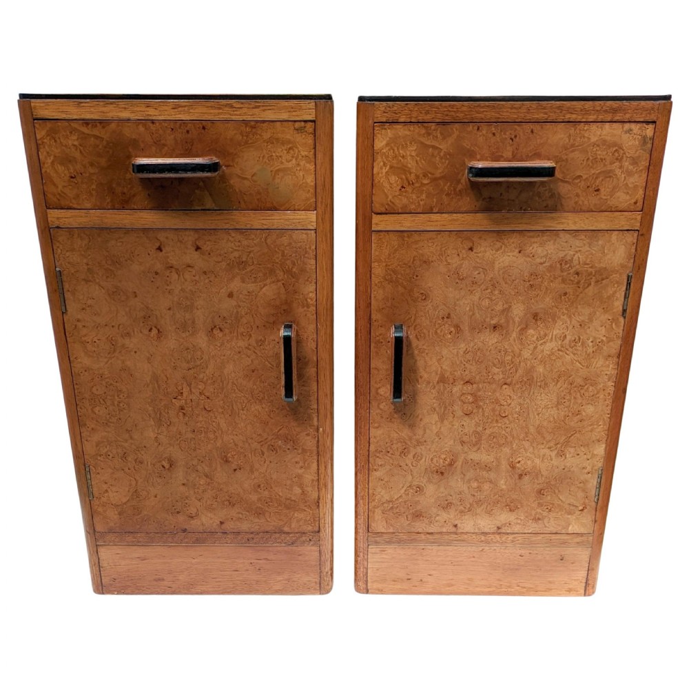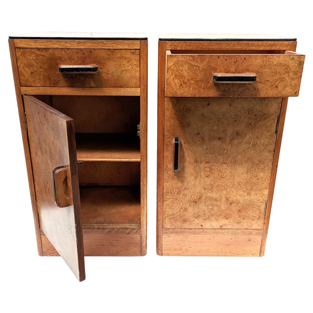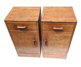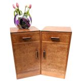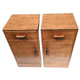 Fabulous pair of matching 1930's Art Deco bedside tables in heavily figured maple veneer with original ebonised wooden handles and ebonised accents. Two generously sized internal storage areas. Each cabinet has a pull out upper drawer which works effortlessly. We've had both cabinets fully and professionally restored and so come to you in very good condition. FREE UK mainland delivery UK customers: we want you to be delighted with your purchases from us and so we offer a full money back guarantee (items must be returned within 14 days in same condition as when sent) if you are not fully satisfied with your purchases from us for what ever reason and would like to return them. Please note : Shipping costs are not refundable. Refunds are only issued once an item has been returned back to us. Refunds are issued within 48 hours in receipt of return.