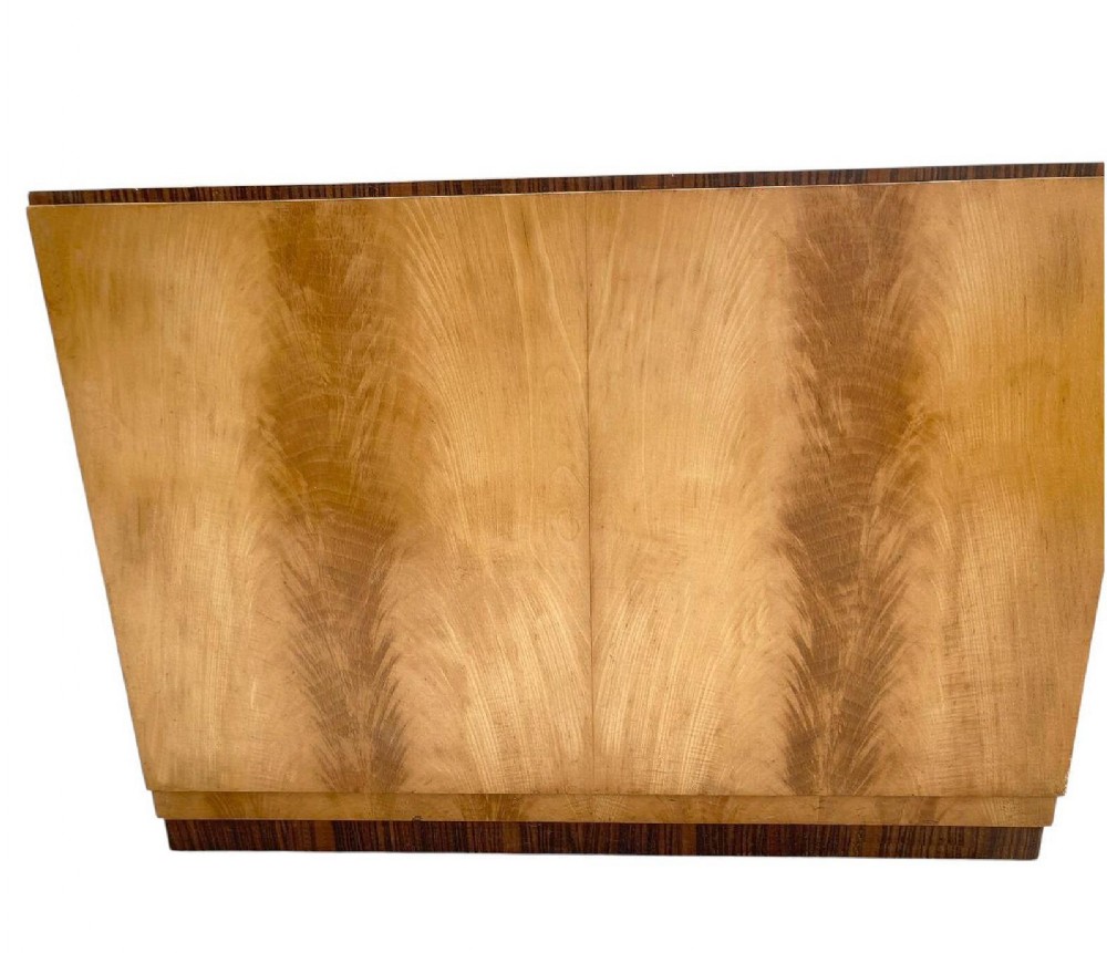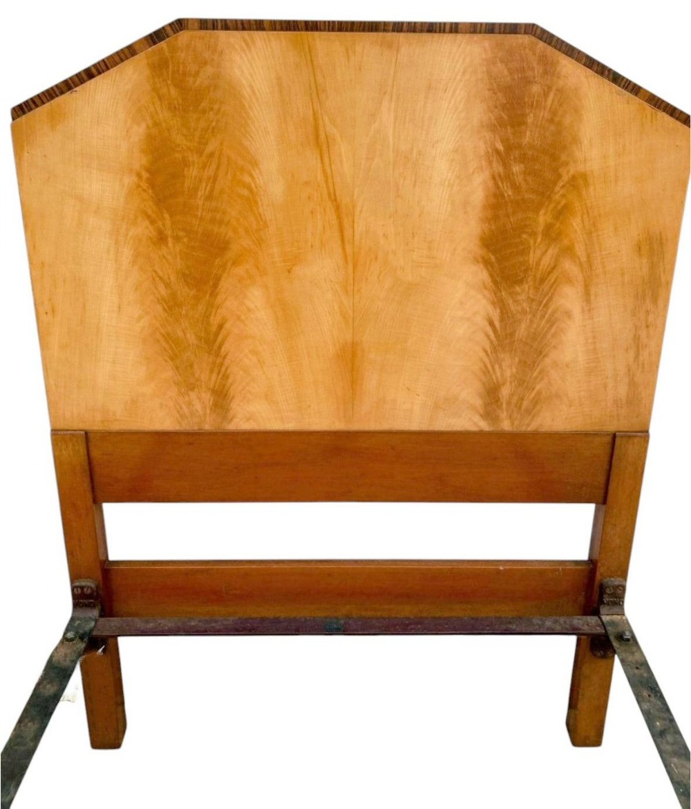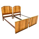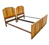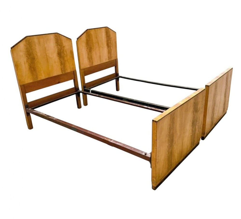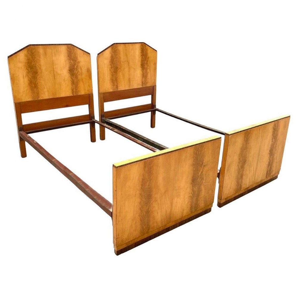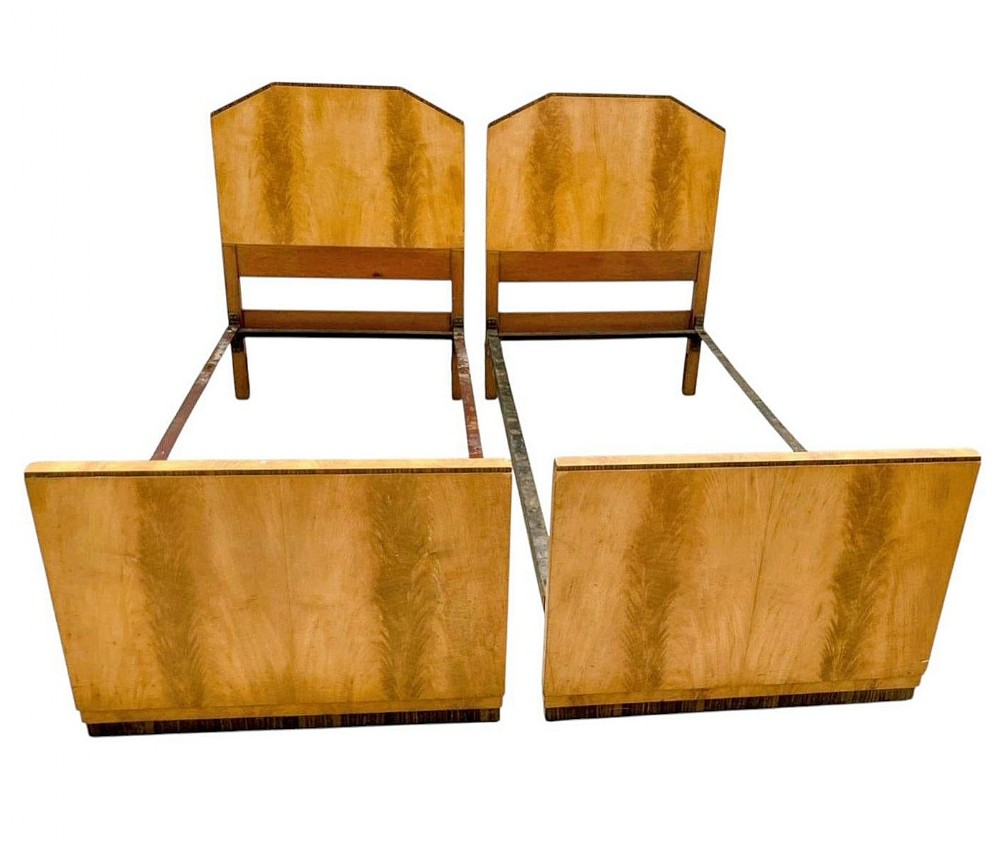 1930s Art deco Matching Pair of Single Beds in Satinwood with a walnut banding to edges to give a very nice geometric feel. Blonde in colour so ideal for Art deco and modern interiors. Condition is excellent having been through our workshops, there are no flaws to mention. Comprises headboard, footboard and two side irons. Comes with a custom-made slatted base so all you need to do is place your mattress on top and you're ready for sleep! Footboard height 66 cm FREE UK Two Man DELIVERY UK customers: we want you to be delighted with your purchases from us and so we offer a full money back guarantee (items must be returned within 14 days in same condition as when sent) if you are not fully satisfied with your purchases from us for what ever reason and would like to return them. Please note : Shipping costs are not refundable. Refunds are only issued once an item has been returned back to us. Refunds are issued within 48 hours in receipt of return.