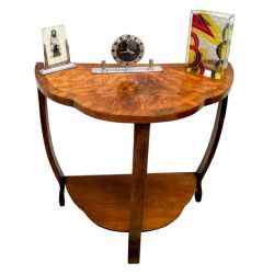 Standing over 4ft wide this is a very stylish and original 1930's Art Deco D shaped console table in Teak wood. This fantastic console has four slightly U-base sweeping legs which support the half circle top and base. Would look great in any room or hallway, has been newly French polished by our onsite restorers, so is in excellent condition. Measurements : Height = 31" (Approx 79cm) Width = 48" (Approx 122cm) Depth = 24" (Approx 61cm) Delivery £45 UK mainland UK customers: we want you to be delighted with your purchases from us and so we offer a full money back guarantee (items must be returned within 14 days in same condition as when sent) if you are not fully satisfied with your purchases from us for what ever reason and would like to return them. Please note : Shipping costs are not refundable. Refunds are only issued once an item has been returned back to us. Refunds are issued within 48 hours in receipt of return.