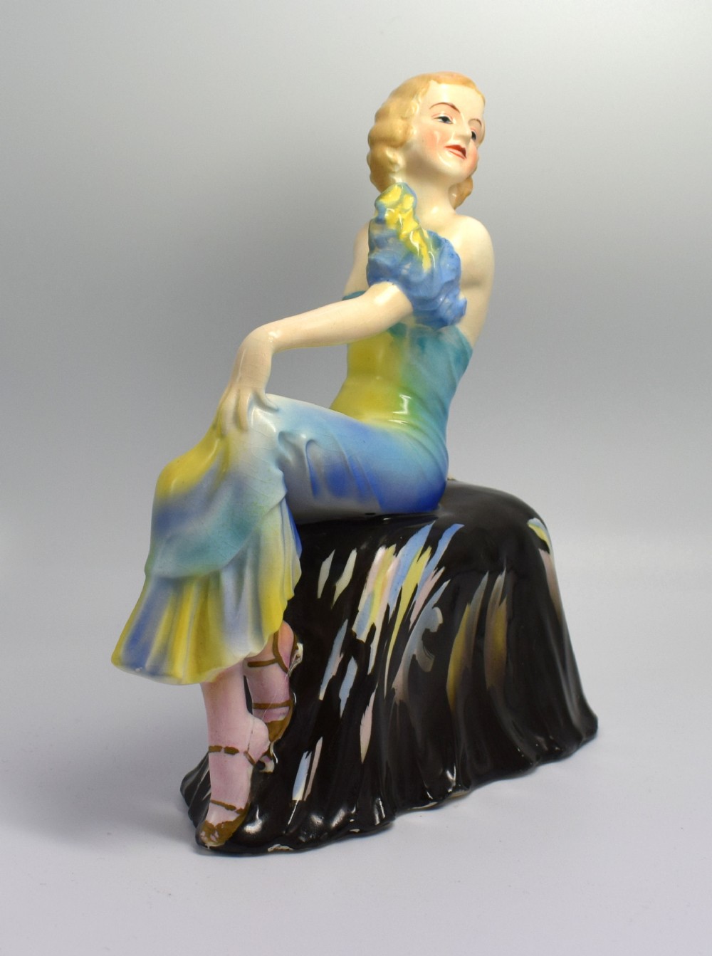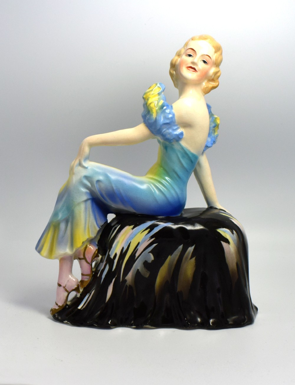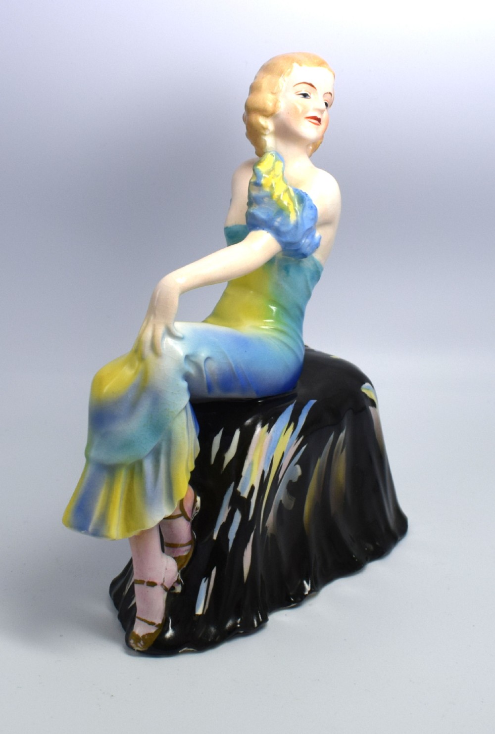 A beautiful, elegant, stylish, Art Deco lady figurine seated on a draped seat. She is in excellent condition with no cracks, chips or restoration. There is some crazing to the glaze, which can be seen on very close inspection. She's been very skillfully and delicately painted giving her delightful features and vibrant colouring. There are no discernible marks on the base to determine her origins. A truly delightful figure defining the real glamour of the 1930's and a great size for displaying. UK customers: we want you to be delighted with your purchases from us and so we offer a full money back guarantee (items must be returned within 14 days in same condition as when sent) if you are not fully satisfied with your purchases from us for what ever reason and would like to return them. Please note : Shipping costs are not refundable. Refunds are only issued once an item has been returned back to us. Refunds are issued within 48 hours in receipt of return. Internal Ref: #11