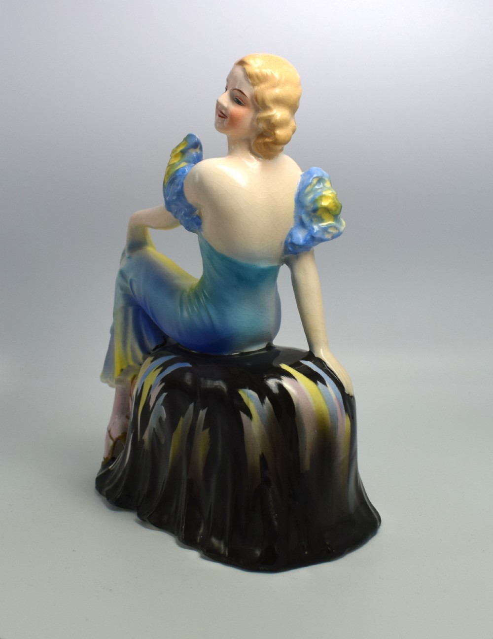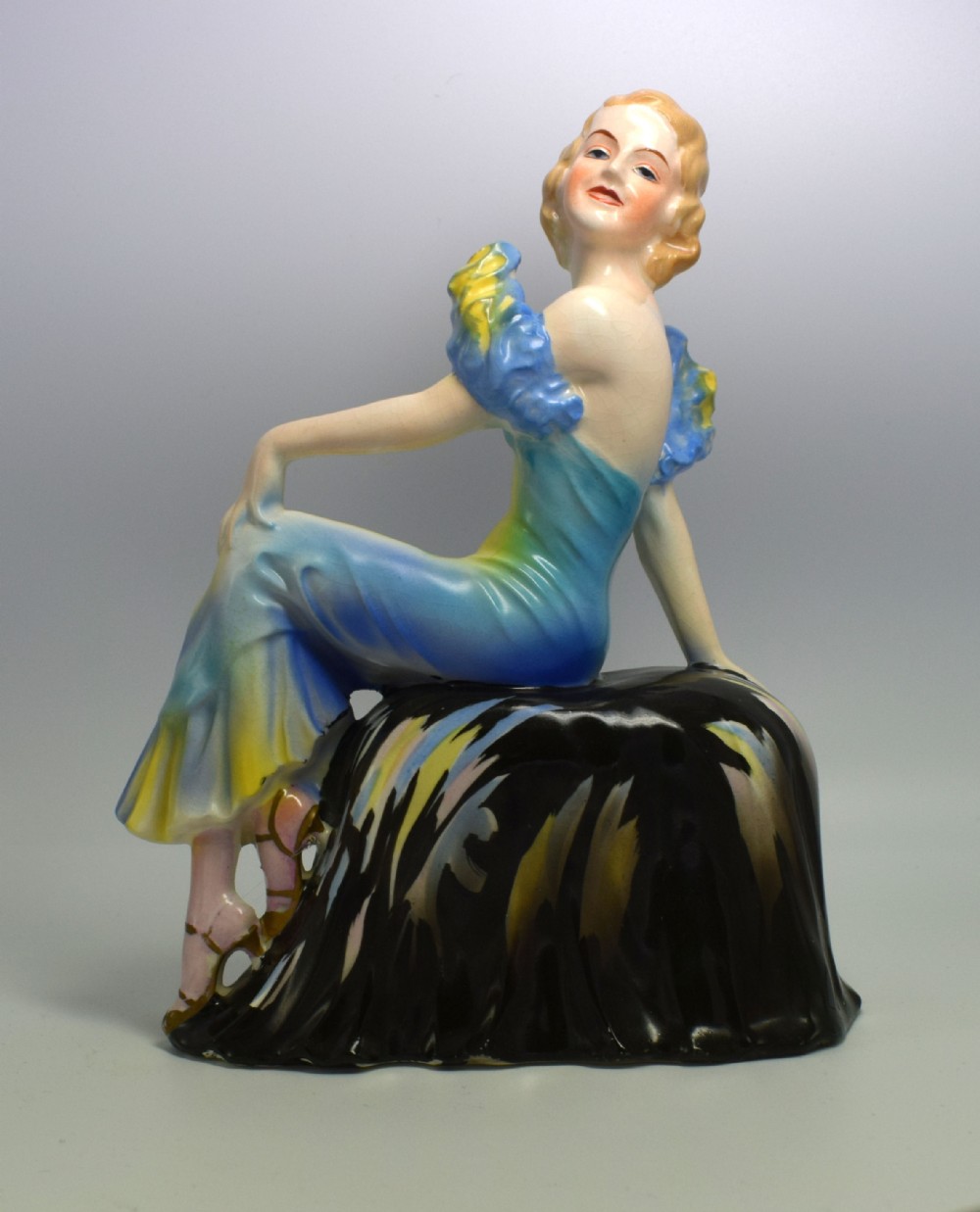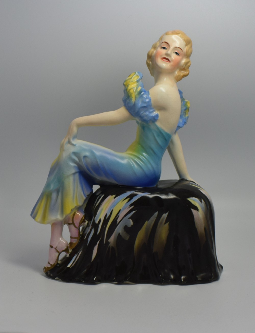 A beautiful, elegant, stylish, Art Deco lady figurine seated on a draped seat. She is in excellent condition with no cracks, chips or restoration. There is some crazing to the glaze, which can be seen on very close inspection. She's been very skillfully and delicately painted giving her delightful features and vibrant colouring. There are no discernible marks on the base to determine her origins. A truly delightful figure defining the real glamour of the 1930's and a great size for displaying. UK customers: we want you to be delighted with your purchases from us and so we offer a full money back guarantee (items must be returned within 14 days in same condition as when sent) if you are not fully satisfied with your purchases from us for what ever reason and would like to return them. Please note : Shipping costs are not refundable. Refunds are only issued once an item has been returned back to us. Refunds are issued within 48 hours in receipt of return. Internal Ref: #11