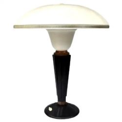 Lovely 1930's Art Deco table lamp with a green ribbed catalin bakelite stem. The base is stepped and circular chrome which balances out with the chrome neck and gallery. Beautifully finished off with a larger than normal mustard coloured glass shade with a red line accent running around the middle. Great lamp and in great condition. Newly rewired. FREE UK MAINLAND DELIVERY
